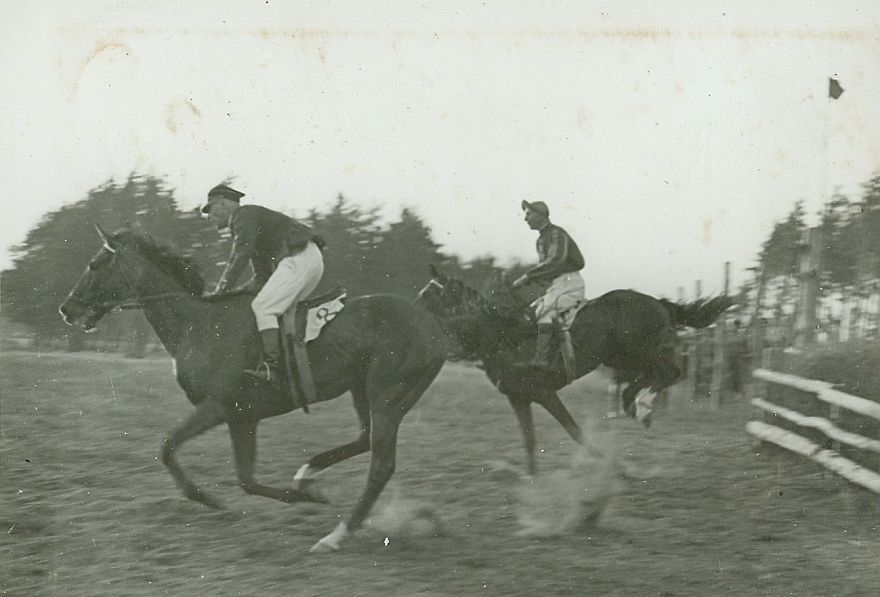 | Nr. inwentarzowy: MŁJ-XVI 1746 / 00 / 104 opis: Okolice toru wyścigów konnych, bieg na przełaj Orpy (wieś, folwark i zaścianek w pow. wilejskim) - powrót z terenu na tor. Za przeszkodą 2 konie: Gorgias pod Piotrem Chilińskim i Zalotna pod Michałem Bohdanowiczem. M. Bohdanowicz w stroju wyścigowym, M. Chiliński w mundurze i białych bryczesach. Na potniku "Gorgiasa" nr 8. W tle drzewa.czas powstania - daty graniczne: 1936-07-16 - 1936-07-16miejsce: Wilno, Pośpieszka.osoby: Por. Mieczysław Chiliński (1900-1939, kampania wrześniowa), 12 Pułk Artylerii Lekkiej. Rtm. Michał Bohdanowicz "Miś" (1903-1948), 13 p.u., dowódca 1 szwadronu "Tatarskiego". tworzywo: papier fotograficzny, błyszczącytechnika: odbitka żelatynowo-srebrowa DOP, czarno-białazespół: album rodziny Leskichwymiary (wys. x szer.): 81 x 117 [mm] Konie: 1. Gorgias - koń, na którym por. M. Chiliński startował w biegach na przełaj. 2. Zalotna, klacz - Shagya X - Szabla, koń, na którym w biegach na przełaj startował M. Bohdanowicz i por. Bukowski.
