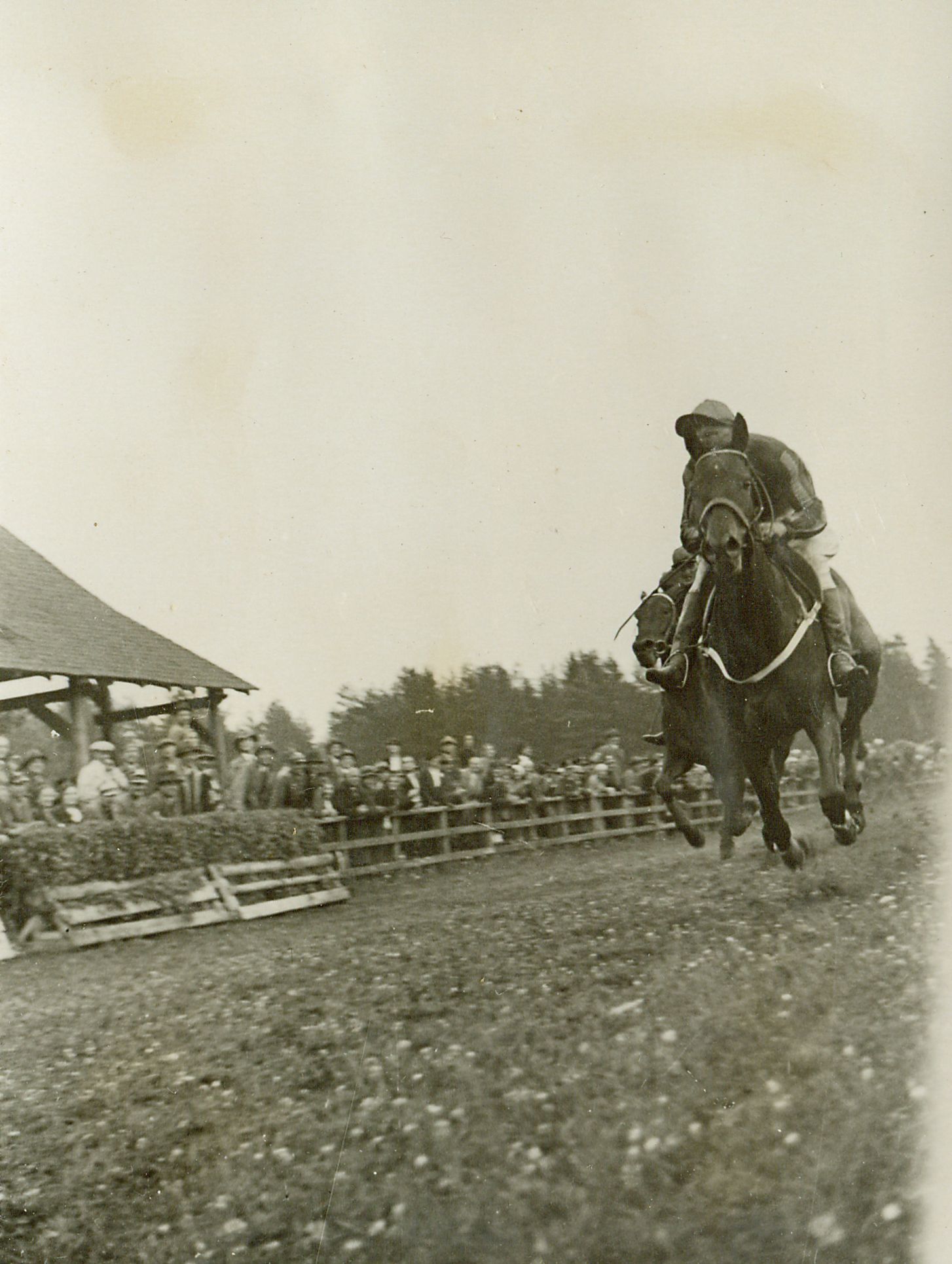 | Nr. inwentarzowy: MŁJ-XVI 1758 / 00 / 101 opis: Tor wyścigów konnych, Steeple-chase Horodźca. Na prostej finiszowej klacz Anna Belle pod rtm. Michałem Bohdanowiczem (1. miejsce), za nimi galopuje klacz Insolente pod por. Szadkowskim (2. miejsce) i niewidoczny na zdjęciu zdobywca 3. miejsca wał. Równy pod por. Żelewskim Jeźdźcy w strojach wyścigowych. Anna Belle w ogłowiu z nachrapnikiem i w napierśniku. W tle ułożona wzdłuż ogrodzenia przeszkoda - hyrda, publiczność, drzewa, fragment zadaszonej trybuny. czas powstania - daty graniczne: 1935-07-21 - 1935-07-21miejsce: Wilno, Pośpieszkaosoby: Rtm. Michał Bohdanowicz 1903-1948 (w l.1932-36 i przed II wojną w 4 p.u., nazywany "Misiem"; miłośnik wyścigów płotowych, przeszkodowych i biegów na przełaj); Por. Czesław Szadkowski 1903-1973 (10 p.u., trener i jeździec sportowy i wyścigowy); niewidoczny w kadrze 1905-1994 (jeździec wyścigowy, jeździec sportowy klasy międzynarodowej, instruktor).tworzywo: papier fotograficzny, błyszczącytechnika: odbitka żelatynowo-srebrowa DOP, czarno-białazespół: album rodziny Bohdanowiczówwymiary (wys. x szer.): 113 x 85 [mm] Konie: 1. Anna Belle, klacz, rasa: xx, maść skarogniada, ur. 1930 - Illuminator i Beluga, hod. Konstantego Biskupskiego, wł. T. Bruszewskiego, później grona oficerów 14 p.u., startowała w wyścigach płaskich, płotowych i przeszkodowych na torach w Warszawie, Łodzi, Lublinie, Lwowie, Zakopanem i Wilnie w l. 1931-1935, m.in. pod M. Bohdanowiczem i Wł. Korytkowskim, który ją także trenował. Opisywana także jako ciemnogniada., na zdjęciu: 1. miejsce 2. Insolente, klacz, rasa: xx, maść gniada, ur. 1928 - po Blue Danube i Reduta, hod. K. hr. Zamoyskiego, wł. Grona Oficerów 10 p.u., w l. 1934-35 startował na niej w Wilnie w wyścigach przeszkodowych por. Szadkowski, który także klacz trenował, na zdjęciu: 2. miejsce 3. Równy, wałach, rasa: półkrwi, maść skarogniada - po Konwent i Powaga, hod. St. Ciemniewski, wł. rtm. K. Choroszewski. Startowali na nim w biegach na przełaj i steeple-chase M. Bohdanowicz i wł. Żelewski, na zdjęciu: nie ma go na zdjęciu, 3. miejsce