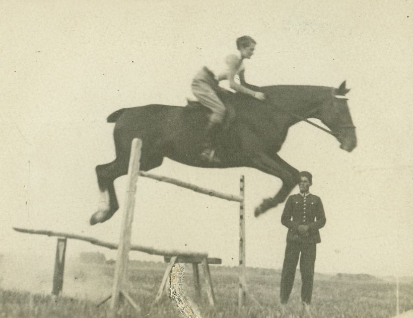 | Nr. inwentarzowy: MŁJ-XVI 1641 / 00 / 004 opis: Roma Brökere w skoku na kl. Bianka przez ustawiony w terenie doublebarre. Przeszkoda z 2 jasnych drągów. Klacz kurtyzowana z odmianami. Rząd sportowy. Amazonka w letnim stroju jeździeckim. Obok przeszkody stoi żołnierz w mundurze.czas powstania - daty graniczne: 1930-01-01 - 1939-08-31miejsce: Polskaosoby: Romana (Roma) Brökere(1909-2001, później Daszkowska)tworzywo: papier fotograficzny, matowytechnika: odbitka żelatynowo-srebrowa DOP, czarno-białazespół: album rodziny Brökerewymiary (wys. x szer.): 86 x 110 [mm] Koń: 1. Bianka, klacz, maść kasztanowata, ur. 1924 - nieznanej hodowli, wł. Romy Brökere, startowała w konkursach skoków przez przeszkody
