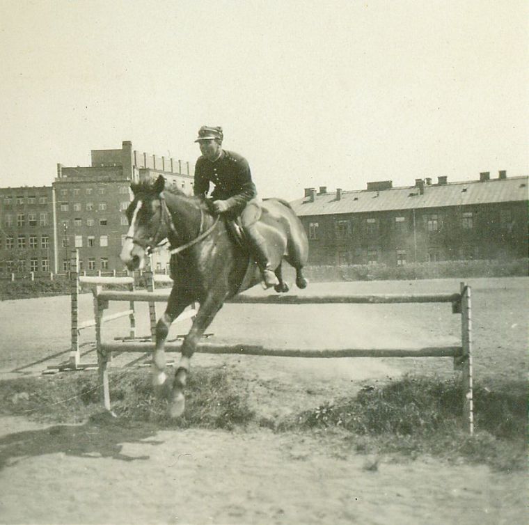 | Nr. inwentarzowy: MŁJ-XVI 1753 / 00 / 145 opis: Rtm. Wilhelm Lewicki w skoku przez przeszkodę - stacjonatę na suchym rowie - na klaczy Mira. Obok inna przeszkoda, w tle stara i nowa zabudowa.data: maj 1930 r.czas powstania - daty graniczne: 1930-05-01 - 1930-05-31miejsce: Warszawa, ul. Koszykowa 79, Wyższa Szkoła Wojenna, ujeżdżalnia położona w kwartale: Koszykowa – Krzywickiego/Sucha – 6 Sierpnia/Nowowiejska – Topolowa/Al. Niepodległościosoby: Rtm. Wilhelm Rogala-Lewicki 1898-1992 Londyn ("Wil", jeździec klasy międzynarodowej, w 1929 r. reprezentował w konkursach W.S.W. - był w niej głównym instruktorem jazdy konnej).tworzywo: papier fotograficzny, błyszczącytechnika: odbitka żelatynowo-srebrowa DOP, czarno-białazespół: album rodziny Bohdanowiczówwymiary (wys. x szer.): 61 x 62 [mm] Koń: 1. Mira, klacz - koń, na którym w konkursach skoków startował w l. 1926-1931 W. Lewicki