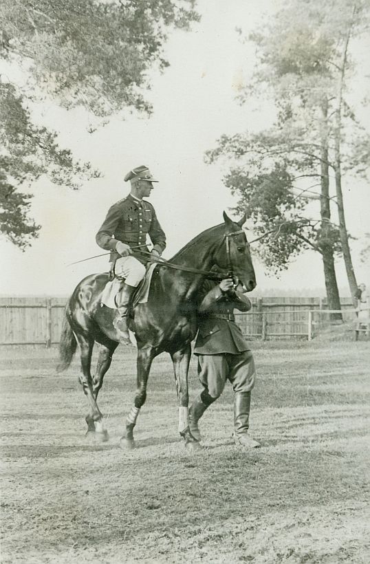 | Nr. inwentarzowy: MŁJ-XVI 1758 / 00 / 100 opis: Tor wyścigów konnych, Wojskowy bieg na przełaj im. 1 Pułku Szwoleżerów Józefa Piłsudskiego. Klacz Manru pod rtm. Michałem Bohdanowiczem po wygraniu wraca do wagi. Jeździec w mundurze i jasnych bryczesach. Konia prowadzi wojskowy - trzyma go krótko, przy pysku. W tle ogrodzenie, drzewa.czas powstania - daty graniczne: 1935-07-18 - 1935-07-18miejsce: Wilno, Pośpieszkaosoby: Rtm. Michał Bohdanowicz 1903-1948 (syn Jana Bohdanowicza i Marii z Cywińskich. W latach 1932-1936 i przed II wojną w 4 Pułku Ułanów Zaniemeńskich, od 1936 w 13 Pułku Ułanów Wileńskich; nazywany "Misiem"; miłośnik wyścigów płotowych, przeszkodowych i biegów na przełaj).tworzywo: papier fotograficzny, błyszczącytechnika: odbitka żelatynowo-srebrowa DOP, czarno-białazespół: album rodziny Bohdanowiczówwymiary (wys. x szer.): 130 x 85 [mm]