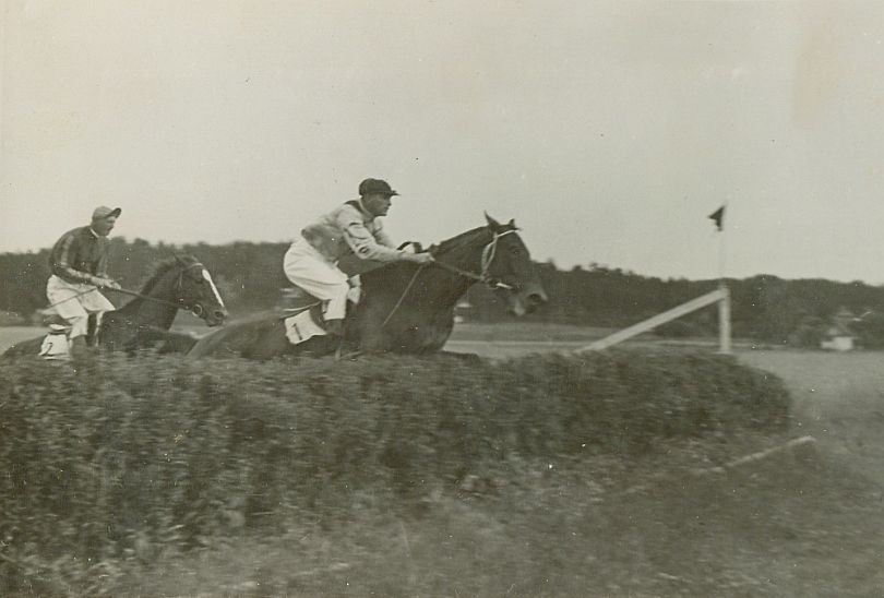 | Nr. inwentarzowy: MŁJ-XVI 1758 / 00 / 021 opis: Tor wyścigów konnych. Steeple-chase im. Ministra Rolnictwa i Reform Rolnych. Na przeszkodzie (żywopłot z suchym rowem) rtm. Michał Bohdanowicz na koniu Bakarat (na potniku numer 2) i por. Edward Tudziński na klaczy Jataka (na potniku numer 1).czas powstania - daty graniczne: 1935-07-07 - 1935-07-07miejsce: Wilno, Pośpieszkaosoby: Rtm. Michał Bohdanowicz 1903-48 (syn Jana Bohdanowicza i Marii z Cywińskich. W latach 1932-36 i przed II wojną w 4 p.u., nazywany "Misiem"; Edward Tudziński (por. w szwadronie zapasowym 26 p.u., właściciel stajni wyścigowej – barwy: E. Tudziński: k. i r. różowe, sz. i cz. czarne), jego konie startowały we Lwowie, Wilnie, Baranowiczach).tworzywo: papier fotograficzny, błyszczącytechnika: odbitka żelatynowo-srebrowa DOP, czarno-białazespół: album rodziny Bohdanowiczówwymiary (wys. x szer.): 85 x 124 [mm] Konie: 1. Bakarat, ogier, rasa: xx, maść kasztanowata, ur. 1925 - (od 1934 wałach), Harsona – Balata, hod. Romana Czaykowskiego, wł. K. Dzierzbickiego, później Z. Cierpickiego. Startował w l. 1927-1937 w gonitwach płaskich, płotowych i przeszkodowych (prawie 100x, 1/3 zwycięstw) na torach w Baranowiczach, Łodzi, Wilnie, Bydgoszczy, Poznaniu, Kielcach, Radomiu, Lublinie, Warszawie. Dosiadali go: M. Bohdanowicz, por. Kwieciński, j. Ustinow, j. Gajewski, dż. Kucharski; trenerzy: S. Kowalski, Z. Cierpicki, S. Balcer, M. Bohdanowicz., na zdjęciu: z lewej, 1. miejsce 2. Jataka, klacz, rasa: xx, maść gniada, ur. 1929 - po Blue Danube i Egaree, ur. 1929, hod. hr. Konstantego Zamoyskiego, wł. Edwarda Tudzińskiego. W 1934 r. uznana za najlepszą steeplerkę. W 1935 r. wystartowała w Wilnie w 2 gonitwach przeszkodowych i zajęła pod właścicielem dwukrotnie 2. m., na zdjęciu: z prawej, 2. miejsce