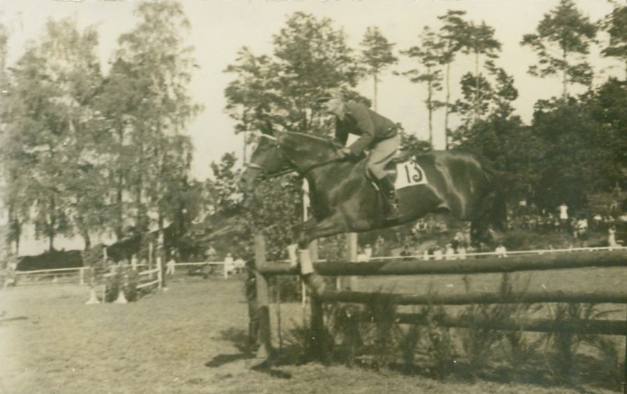 | Nr. inwentarzowy: MŁJ-XVI 1519 / 00 / 007 opis: por. Zdzisław Kawecki 10 p.s.k., na koniu w skoku, rząd sportowy, nr 13, koń Ostryga; plac konkursowy, zalesiony pagórekdata: pierwsza połowa lat 30. XX w., ciepła pora rokuczas powstania - daty graniczne: 1930-03-01 - 1935-09-30miejsce: Polskaosoby: Zdzisław Szczęsny Kawecki Gozdawa (1902-1940). 18 p.u., 26 p.u., 10 p.s.k. KIJK 1930, WKIJK 1930-31, do 1938 etatowy instruktor jazdy konnej w C.W.K.. 1936 – IO, WKKW, koń Bambino – 18. ind., srebro zesp.tworzywo: papier fotograficzny, półmatowytechnika: odbitka żelatynowo-srebrowa DOP, czarno-białazespół: album rodziny Nieniewskichwymiary (wys. x szer.): 87 x 138 [mm] Koń: 1. Ostryga, klacz