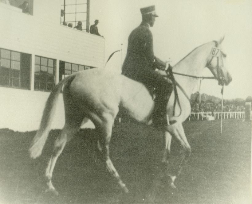 | Nr. inwentarzowy: MŁJ-XVI 1639 / 00 / 050 opis: Konkurs skoków „Grosser Preis von Aachen". Szwajcar mjr Charles-Gustave Kuhn na siwej klaczy Lolette wjeżdża na parkur. Ogłowie wędzidłowe z numerem 87, wytok. W tle jasna trybuna z dużymi oknami i tarasem, szranki, publiczność.czas powstania - daty graniczne: 1929-01-01 - 1939-08-31miejsce: Akwizgran (Aachen)osoby: Szwajcar mjr Charles-Gustave Kuhn - skoczek, olimpijczyk z Akwizgranu 1928inne nazwy własne: „Grosser Preis von Aachen” (Wielka Nagroda Akwizgranu)tworzywo: papier fotograficzny, matowytechnika: odbitka żelatynowo-srebrowa z innej odbitkizespół: album Clemensa Nagla Międzynarodowi artyści w jeździe przez przeszkodywymiary (wys. x szer.): 124 x 148 [mm] Koń: 1. Lolette, klacz