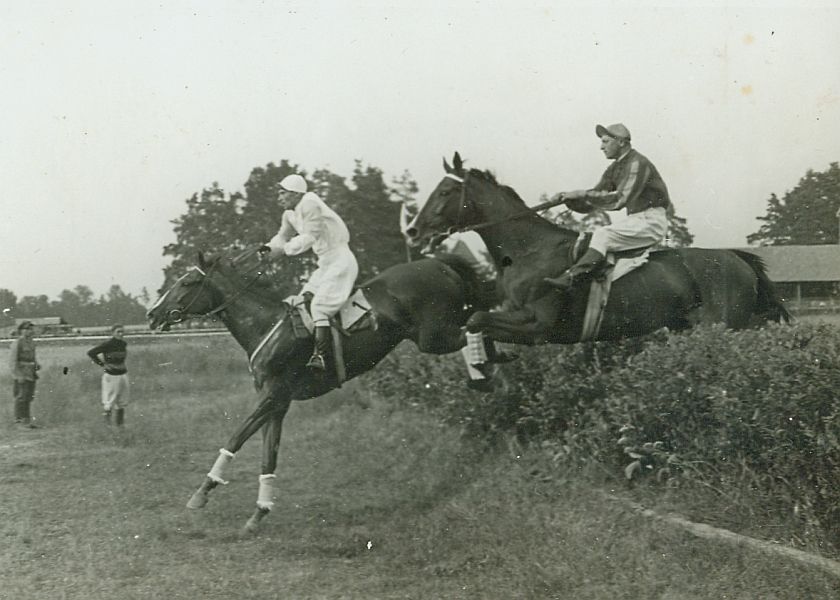 | Nr. inwentarzowy: MŁJ-XVI 1746 / 00 / 082 opis: Tor wyścigów konnych. Steeple-chase – skok. Ląduje prowadzący Mieczysław Nestorowicz na koniu Enigma III, nad przeszkodą Michał Bohdanowicz na koniu Nic ci do tego. Jeźdźcy w strojach wyścigowych.(L. Nestorowicz - jasne: czapka, kurtka, bryczesy, M. Bohdanowicz - jasne bryczesy, ciemna kurtka z jaśniejszymi pasami na rękawach, czapka w tonacji pasów. W tle dwie osoby.czas powstania - daty graniczne: 1936-07-16 - 1936-07-16miejsce: Wilno, Pośpieszka.osoby: Rtm. Mieczysław Mateusz Nestorowicz „Negus”, 2 p.szw. Rtm. Michał Bohdanowicz "Miś" (1903-1948), 13 p.u., dowódca 1 szwadronu "Tatarskiego". tworzywo: papier fotograficzny, błyszczącytechnika: odbitka żelatynowo-srebrowa DOP, czarno-białazespół: album rodziny Leskichwymiary (wys. x szer.): 84 x 117 [mm] Konie: 1. Enigma III, klacz - koń, na którym rtm. M. Nastorowicz startował w steeple-chase., na zdjęciu: pierwsza 2. Nic ci do tego - koń, na którym M. Bohdanowicz startował w steeple-chase., na zdjęciu: drugi