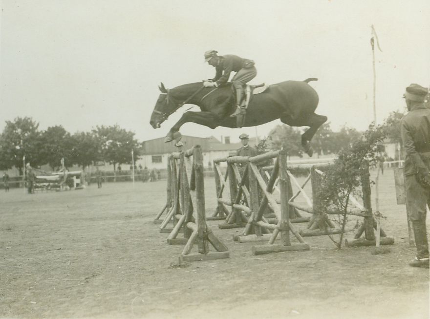 | Nr. inwentarzowy: MŁJ-XVI 1519 / 00 / 026 opis: mjr Józef Trenkwald w skoku przez triple-barre z kratownic z drągów, przy przeszkodach stoją żołnierze - koń Madziadata: pierwsza połowa lat 30, ciepła pora rokuczas powstania - daty graniczne: 1930-04-01 - 1935-09-30miejsce: Polska, Grudziądz, C.W.K. [Centrum Wyszkolenia Kawalerii]osoby: mjr Józef Trenkwald (1897-1956), wybitny jeździec, instruktor jazdy konnej, olimpijczyk (1928, WKKW, zespołowo brązowy medal)tworzywo: papier fotograficzny, błyszczącytechnika: odbitka żelatynowo-srebrowa DOP, czarno-białazespół: album rodziny Nieniewskichwymiary (wys. x szer.): 90 x 120 [mm] Koń: 1. Madzia, klacz, maść skarogniada - hod. NN, wł. MSWojsk., kurtyzowana; koń Trenkwalda w latach 30., m.in. wygrany PN w Łazienkach w 1931 r.