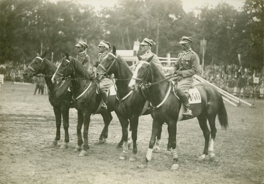 | Nr. inwentarzowy: MŁJ-XVI 1603 / 00 / 032 opis: Krajowe i Międzynarodowe Konkursy Hipiczne, płyta hipodromu - prezentacja, polska ekipa, która zdobyła PN: od lewej: mjr Józef Trenkwald na Madzia, rtm. Kazimierz Szosland na Alli, por. Jan Sałęga na Nela, por. Zygmunt Ruciński na Roksanadata: podano czas trwania zawodówczas powstania - daty graniczne: 1931-05-28 - 1931-06-08miejsce: Warszawa, hipodrom w Łazienkachosoby: mjr Józef Trenkwald (IO 1928), rtm. Kazimierz Szosland (IO 1924 i 1928), kpt. Jan Sałęga (artylerzysta), por Zygmunt Rucińskitworzywo: papier fotograficzny, błyszczącytechnika: odbitka żelatynowo-srebrowa DOP, czarno-białawymiary (wys. x szer.): 129 x 181 [mm] Konie: 1. Madzia, klacz, maść skarogniada - hod. NN, wł. MSWojsk., kurtyzowana; koń Trenkwalda w latach 30., m.in. wygrany PN w Łazienkach w 1931 r. 2. Alli vel Kaktus, wałach, rasa: półkrwi, maść kasztanowata, ur. 1916 - hod. Stefan Walewskiego. Skoczek, koń służb. rtm. J. Sienkiewicza, potem por. E. Grunwalda. Pod Szoslandem w 1928 r. na IO w Amsterdamie – indywidualnie 13., srebro zespołowo. 3. Nela, klacz 4. Roksana, klacz, maść skarogniada - hod. Około Kułak, Siewiersk, wł. por. Ruciński; W 1931 i 1933 r. 1. miejsce w PN w Warszawie. W 1932 r. 1. miejsce w MP w skokach