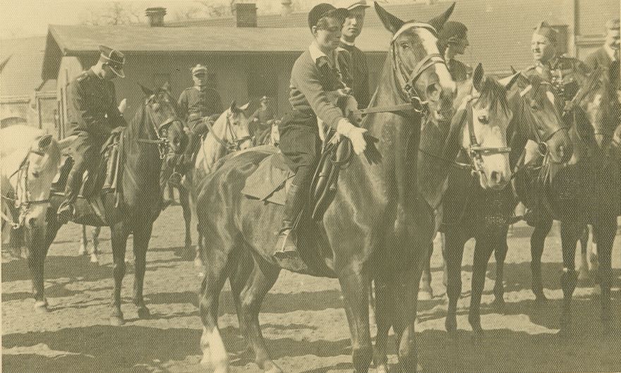 | Nr. inwentarzowy: MŁJ-XVI 1641 / 00 / 003 opis: Rajd Poznań-Gniezno - popas. Około 10 jeźdźców siedzi na stojących koniach. Cywile obojga płci, oficerowie, różne rzędy i stroje. Na pierwszym planie Roma Brökere na klaczy Bianka - poklepuje konia po szyi.czas powstania - daty graniczne: 1930-01-01 - 1939-08-31miejsce: trasa Poznań - Gnieznoosoby: Romana (Roma) Brökere(1909-2001, później Daszkowska)tworzywo: papier fotograficzny, satynowytechnika: odbitka żelatynowo-srebrowa DOP, czarno-białazespół: album rodziny Brökerewymiary (wys. x szer.): 89 x 138 [mm] Koń: 1. Bianka, klacz, maść kasztanowata, ur. 1924 - nieznanej hodowli, wł. Romy Brökere, startowała w konkursach skoków przez przeszkody