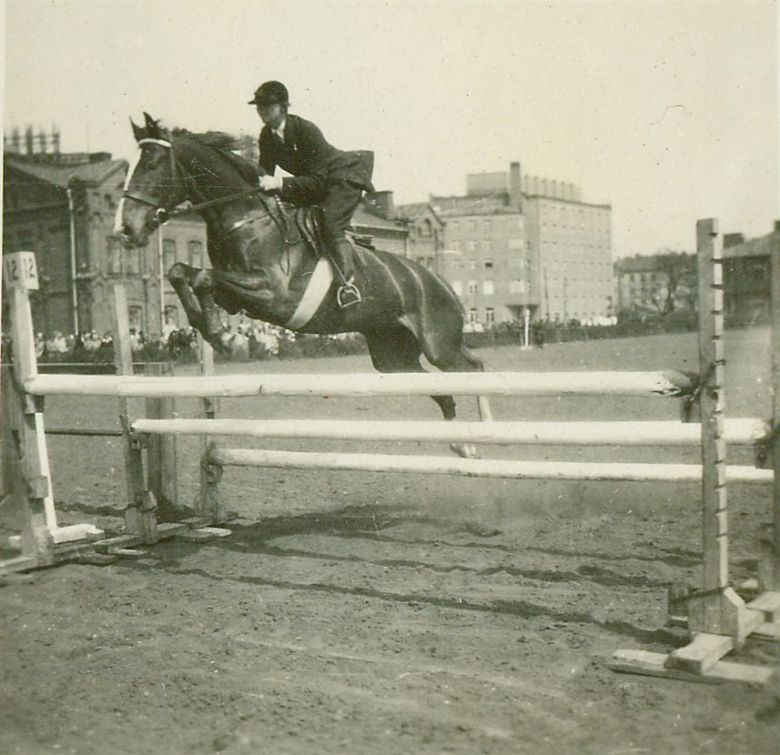 | Nr. inwentarzowy: MŁJ-XVI 1753 / 00 / 155 opis: Konkurs wewnętrzny Klubu Sportowego Rodziny Wojskowej na ujeżdżalni W.S.Woj. Irena Chodkiewiczówna skacze na klaczy Fanfara przez przeszkodę nr 12 - triple-barre. Za szrankami kibice, w tle zabudowania.data: w albumie: maj 1930 r., ale zawody odbyły się w połowie czerwcaczas powstania - daty graniczne: 1930-06-14 - 1930-06-15miejsce: Warszawa, ul. Koszykowa 79, Wyższa Szkoła Wojenna, ujeżdżalnia położona w kwartale: Koszykowa – Krzywickiego/Sucha – 6 Sierpnia/Nowowiejska – Topolowa/Al. Niepodległościosoby: Irena Chodkiewiczówna 1900-1981 (nazywana Reną, po mężu Głębocka, siostra Zofii Chodkiewiczówny).inne nazwy własne: W.S.W - WSW - W.S.Woj. - Wyższa Szkoła Wojennatworzywo: papier fotograficzny, błyszczącytechnika: odbitka żelatynowo-srebrowa DOP, czarno-białazespół: album rodziny Bohdanowiczówwymiary (wys. x szer.): 60 x 62 [mm] Koń: 1. Fanfara, klacz, maść kasztanowata - po Finnländer xx (ojciec Zbója IV), wł. Ireny Chodkiewiczówny, później Głębockiej, która startowała na swojej klaczy w konkursach hipicznych i biegach myśliwskich