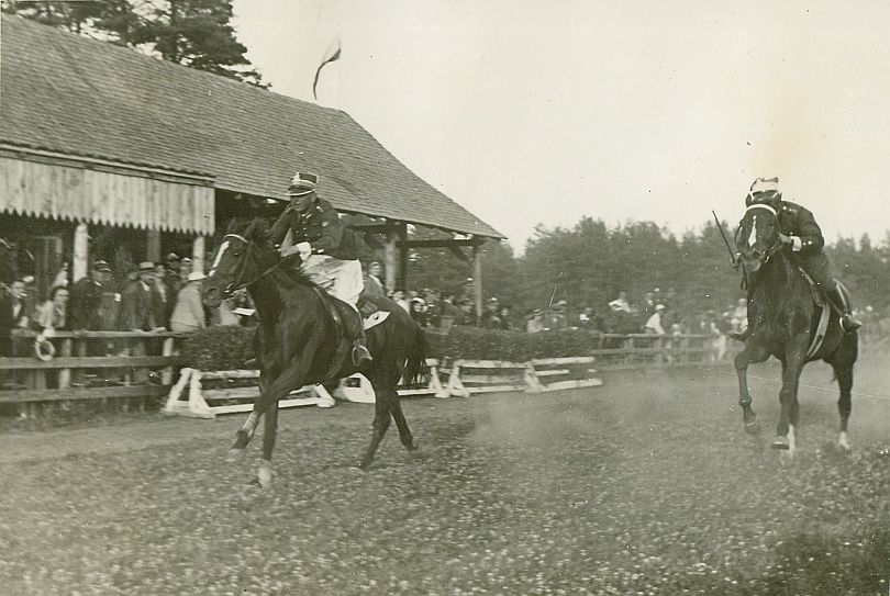 | Nr. inwentarzowy: MŁJ-XVI 1758 / 00 / 044 opis: Tor wyścigów konnych lub jego okolice, Bieg na przełaj im. 3 Pułku Szwoleżerów Mazowieckich im. Pułkownika Jana Kozietulskiego. Dwa konie na prostej finiszowej. Z lewej klacz Złota Pani pod rtm. Michałem Bohdanowiczem (zwycięzcy) w walce z Wizją (z prawej, pod jeźdźcem w mundurze z jasnym otokiem na rogatywce.czas powstania - daty graniczne: 1935-07-04 - 1935-07-04miejsce: Wilno, Pośpieszkaosoby: Rtm. Michał Bohdanowicz 1903-1948 (syn Jana Bohdanowicza i Marii z Cywińskich. W latach 1932-1936 i przed II wojną w 4 Pułku Ułanów Zaniemeńskich, od 1936 w 13 Pułku Ułanów Wileńskich; nazywany "Misiem"; miłośnik wyścigów płotowych, przeszkodowych i biegów na przełaj).tworzywo: papier fotograficzny, błyszczącytechnika: odbitka żelatynowo-srebrowa DOP, czarno-białazespół: album rodziny Bohdanowiczówwymiary (wys. x szer.): 85 x 124 [mm] Konie: 1. Złota Pani, klacz, rasa: xx, maść kasztanowata, ur. 1927 - po Schlingel i Rola, ur. 1927, hod. W. Dzierzbicki, w l. 1934-1937 startowała w ujeżdżeniu, skokach i WKKW (w 1935 r. I m. w MP WKKW pod Włodzimierzem Korytkowskim) oraz w biegach na przełaj, na zdjęciu: z lewej, 1. miejsce 2. Wizja, klacz - koń, na którym w biegach na przełaj startował m.in. rtm. Władysław Zgorzelski, na zdjęciu: z prawej