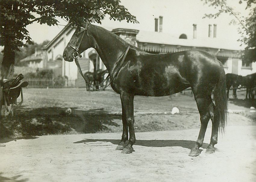 | Nr. inwentarzowy: MŁJ-XVI 1754 / 04 / 014 opis: Portret klaczy Farsa. Koń w ogłowiu z nachrapnikiem polskim stoi na drodze lub skraju placu. Wodze zarzucone na szyję. Z przodu fragment siodła (nie widać niosącej je osoby). W tle konie przy koniowiązach, zabudowania koszarowe, stajnie.data: maj 1932 r.czas powstania - daty graniczne: 1932-05-01 - 1932-05-31miejsce: Warszawa, ujeżdżalnia 1 Dywizjonu Artylerii Konnejtworzywo: papier fotograficzny, błyszczącytechnika: odbitka żelatynowo-srebrowa DOP, czarno-białazespół: album rodziny Bohdanowiczówwymiary (wys. x szer.): 88 x 117 [mm] Koń: 1. Farsa, klacz, maść kara - po Jarnicoton i Baśka, hod. J. Gorayski; koń, na którym startował Roman Pohorecki (m.in. w l. 30. XX w. sukcesy na hipodromie w Warszawie)