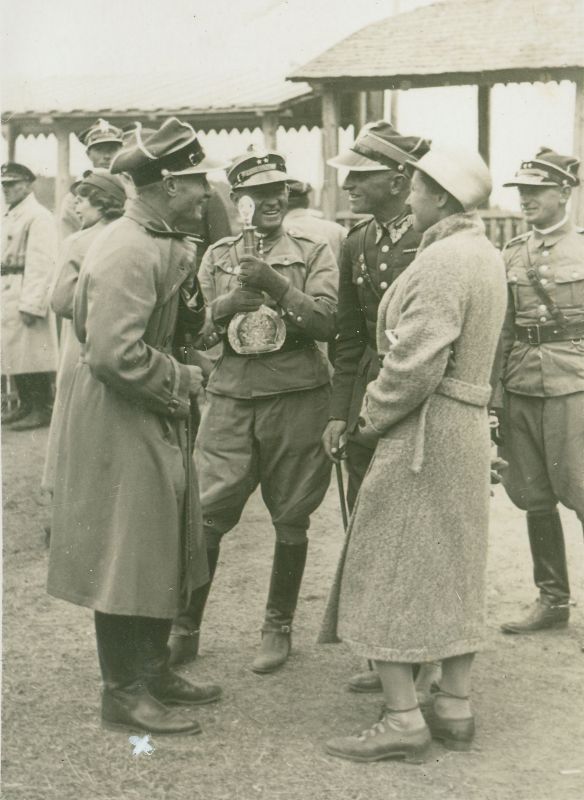 | Nr. inwentarzowy: MŁJ-XVI 1757 / 00 / 027 opis: Tor wyścigów konnych. W rozmowie czterech poruczników i Wanda Bohdanowicz. Pierwszy z lewej por. Juliusz Żwan - zwycięzca gonitwy przeszkodowej im. Wileńskiego Prywatnego Banku Handlowego (na klaczy Gazella II). Kryształowy puchar - karafkę trzyma niezidentyfikowany porucznik. Obok stoi por. Michał Bohdanowicz i jego żona Wanda. Z prawej niezidentyfikowany porucznik.data: 5 lipca 1934 r. - dzień, w którym rozegrano opisywaną gonitwęczas powstania - daty graniczne: 1934-07-05 - 1934-07-05miejsce: Wilno, Pośpieszkaosoby: Por. Juliusz Żwan ur. 1904 (5 p.a.l., we wrześniu 1939 r. w stopniu kapitana dowodził bateriami: najpierw armat, potem haubic, zaginął na Kresach); por. Michał Bohdanowicz 1903-48 (syn Jana Bohdanowicza i Marii z Cywińskich. W latach 1932-36 i przed II wojną w 4 p.u., nazywany "Misiem", mąż Wandy zd. Leskiej); Wanda Bohdanowicz zd. Leska 1908-1991 (córka Juliusza Leskiego i Marii zd. Olszyńskiej, żona Michała Bohdanowicza.tworzywo: papier fotograficzny, błyszczącytechnika: odbitka żelatynowo-srebrowa DOP, czarno-białazespół: album rodziny Bohdanowiczówwymiary (wys. x szer.): 78 x 57 [mm] Koń: 1. Gazella II, klacz, rasa: xx, maść gniada, ur. 1928 - po Manton i Gumdrop, hod. J. Daszkiewicza, wł. J. Łaszkiewicza, następnie por. A. Gucewicza, w 1934 r. grona oficerów 13 D.A.K., koń trenowany przez J. Goszczyńskiego, który także dosiadał klaczy w gonitwach przeszkodowych, w steeplach startował też na niej J. Żwan, na zdjęciu: nie ma jej na zdjęciu