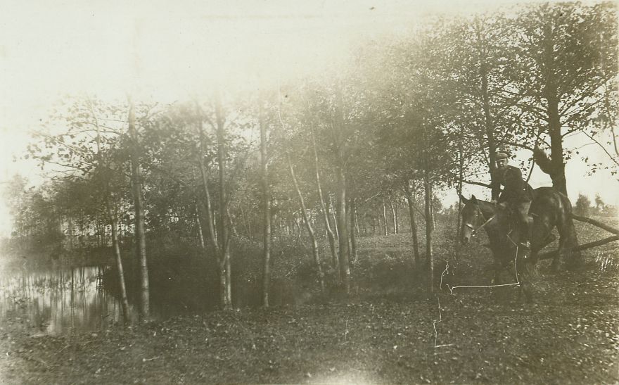 | Nr. inwentarzowy: MŁJ-XVI 1743 / 00 / 072 opis: Zagajnik na skraju stawu lub innego akwenu. Rtm. Adam Królikiewicz w skoku przez przeszkódkę - kopertę między drzewami. Klacz Betka ciemnej maści.czas powstania - daty graniczne: 1930-10-01 - 1930-10-31miejsce: Majątek Słaboszewiczów - Ostrowiec koło Wołominaosoby: rtm. Adam Królikiewicz (1894-1966) 1 p.szw., wybitny jeździec, medalista olimpijskitworzywo: papier fotograficzny, błyszczącytechnika: odbitka żelatynowo-srebrowa DOP, czarno-białazespół: album rodziny Leskichwymiary (wys. x szer.): 71 x 112 [mm] Koń: 1. Betka
