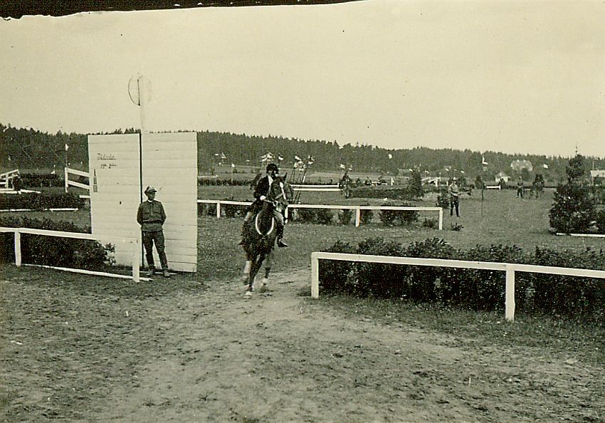 | Nr. inwentarzowy: MŁJ-XVI 1756 / 02 / 020 opis: Tor wyścigów konnych podczas rozgrywania konkursów. Krystyna Bohdanowicz (w konkursowym stroju jeździeckim) wyjeżdża na klaczy Wisła ze szranek po zakończonym przejeździe. Parkur ustawiony wewnątrz toru, wyjazd prowadzi przez bieżnię, koło celownika, obok którego stoi żołnierz.data: czerwiec 1933 r.czas powstania - daty graniczne: 1933-06-01 - 1933-06-30miejsce: Wilno, Pośpieszkaosoby: Krystyna Bohdanowicz ("Krysia", córka Jana Bohdanowicza i Marii "Maryni" zd. Cywińskiej, siostra Heleny i Michała).tworzywo: papier fotograficzny, błyszczącytechnika: odbitka żelatynowo-srebrowa DOP, czarno-białazespół: album rodziny Bohdanowiczówwymiary (wys. x szer.): 41 x 57 [mm] Koń: 1. Wisła, klacz - koń, na którym w 1933 r. startowała w konkursach w Wilnie Krystyna Bohdanowicz