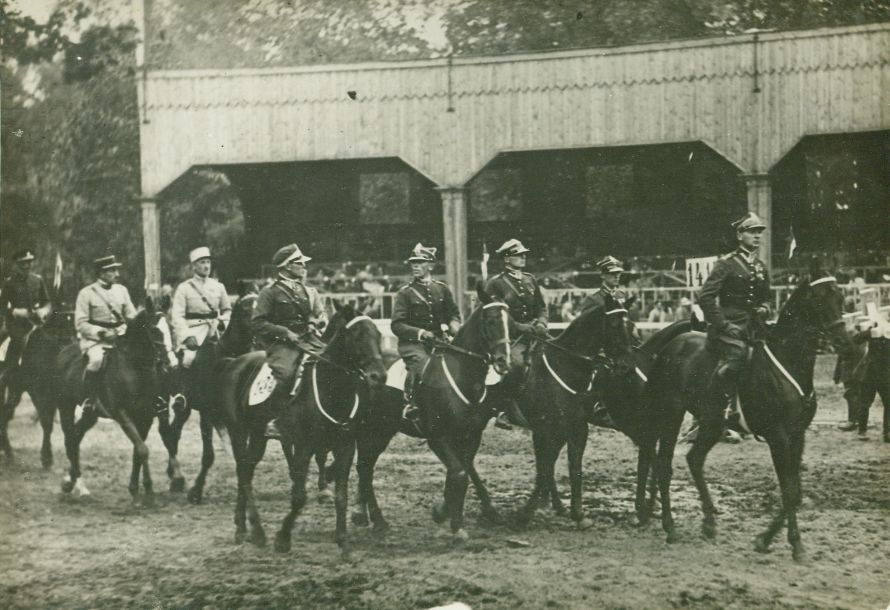 | Nr. inwentarzowy: MŁJ-XVI 1603 / 00 / 021 opis: Międzynarodowe Konkursy Hipiczne, płyta hipodromu, trybuna. Prawdopodobnie wyjazd do dekoracji po PN: drużyna polska (M. Antoniewicz, K. Gzowski, H. Roycewicz, W. Zgorzelski i szef ekipy K. Rómmel); dalej zawodnicy z Francji i Czechosłowacji.data: podano czas trwania zawodówczas powstania - daty graniczne: 1928-09-16 - 1928-09-26miejsce: Warszawa, hipodrom w Łazienkachosoby: mjr Michał Woysym-Antoniewicz na Banzaj, por. Kazimierz Gzowski na Mylord, por. Henryk Leliwa-Roycewicz na Black Boy, por. Władysław Zgorzelski na Ładna, szef ekipy, trener ppłk Karol Rómmeltworzywo: papier fotograficzny, błyszczącytechnika: odbitka żelatynowo-srebrowa DOP, czarno-białawymiary (wys. x szer.): 124 x 173 [mm] Konie: 1. Banzaj, wałach 2. Black Boy, wałach, maść kara, ur. 1922 - import z Irlandii, wł. H. Roycewicza, który startował na nim na przełomie l. 20. i 30., w 1928 r. w ekipie, która zdobyła w Warszawie Puchar Narodów 3. Ładna, klacz 4. Mylord, wałach - wł. kpt. Szilagyi, imp. z Irlandii, IO w 1928 w Amsterdamie - skoki (zesp. srebro, ind. 4/5 m.)