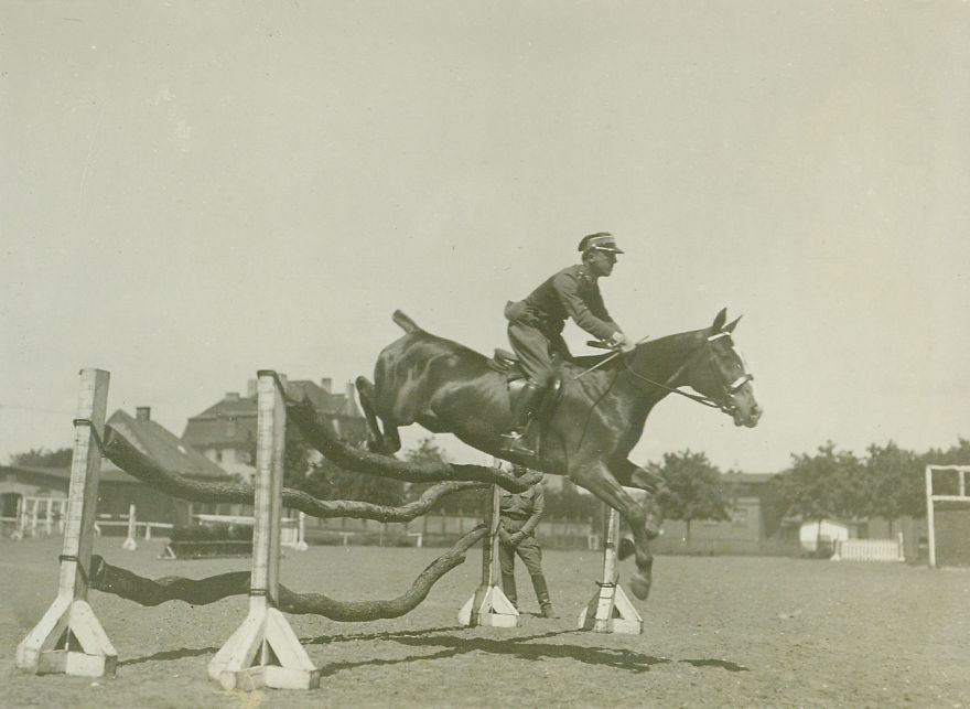 | Nr. inwentarzowy: MŁJ-XVI 1519 / 00 / 037 opis: mjr Józef Trenkwald w skoku przez okser z malowniczo wygiętych drągów - koń Madziadata: pierwsza połowa lat 30, ciepła pora rokuczas powstania - daty graniczne: 1930-04-01 - 1935-09-30miejsce: Polska, Grudziądz, C.W.K. [Centrum Wyszkolenia Kawalerii]osoby: mjr Józef Trenkwald (1897-1956), wybitny jeździec, instruktor jazdy konnej, olimpijczyk (1928, WKKW, zespołowo brązowy medal)tworzywo: papier fotograficzny, błyszczącytechnika: odbitka żelatynowo-srebrowa DOP, czarno-białazespół: album rodziny Nieniewskichwymiary (wys. x szer.): 44 x 58 [mm] Koń: 1. Madzia, klacz, maść skarogniada - hod. NN, wł. MSWojsk., kurtyzowana; koń Trenkwalda w latach 30., m.in. wygrany PN w Łazienkach w 1931 r.