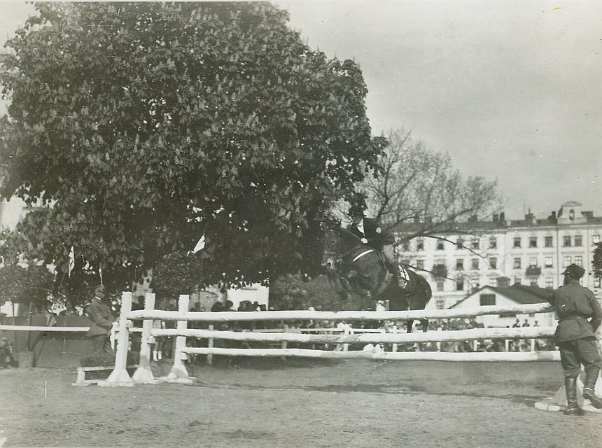 | Nr. inwentarzowy: MŁJ-XVI 1744 / 00 / 052 opis: Konkurs Klubu Sportowego Rodziny Wojskowej. Przez triplebarre skacze Anna Leska na klaczy Lola. Szeroka, jasna przeszkoda, po bokach 2 żołnierzy. Koń ciemnej maści, w rzędzie sportowym. Amazonka w ciemnym stroju jeździeckim. W tle drzewo, budynki.czas powstania - daty graniczne: 1931-05-14 - 1931-05-14miejsce: Warszawa, ujeżdżalnia Szwadronu Sztabowegoosoby: Anna Leska (1910-1998)tworzywo: papier fotograficzny, błyszczącytechnika: odbitka żelatynowo-srebrowa DOP, czarno-białazespół: album rodziny Leskichwymiary (wys. x szer.): 91 x 120 [mm] Koń: 1. Lola, klacz