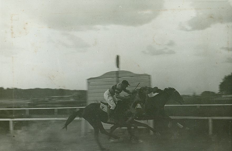 | Nr. inwentarzowy: MŁJ-XVI 1746 / 00 / 031 opis: Tor wyścigów konnych, steeple-chase, finisz. Po zielonej bieżni galopują 2 konie. Pierwszy Nic ci do tego pod. Michałem Bohdanowiczem (2.m.), druga Tenówna pod Janem Goszczyńskim (3. m.). Jeźdźcy w strojach wyścigowych. W tle bariera, celownik.czas powstania - daty graniczne: 1936-07-02 - 1936-07-02miejsce: Wilno, Pośpieszka.osoby: Rtm. Michał Bohdanowicz "Miś" (1903-1948), 13 p.u., dowódca 1 szwadronu "Tatarskiego". Por. Jan Goszczyński (1896-?), 5 DAK, właściciel stajni wyścigowej.tworzywo: papier fotograficzny, błyszczącytechnika: odbitka żelatynowo-srebrowa DOP, czarno-białazespół: album rodziny Leskichwymiary (wys. x szer.): 86 x 127 [mm] Konie: 1. Nic ci do tego - koń, na którym M. Bohdanowicz startował w steeple-chase., na zdjęciu: 2. m. - na zdjęciu pierwszy na celowniku. 2. Tenówna, klacz - koń, na którym J. Goszczyński startował w steeple-chase., na zdjęciu: 3. m. - na zdjęciu druga na celowniku.