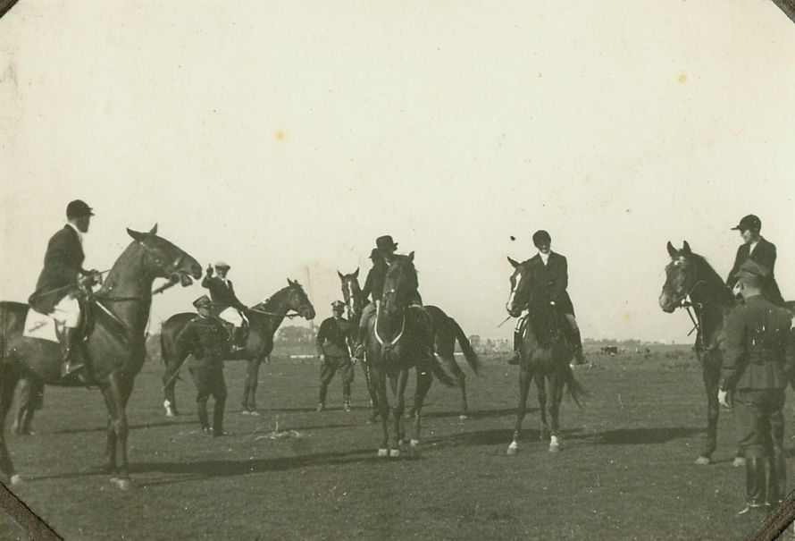 | Nr. inwentarzowy: MŁJ-XVI 1629 / 00 / 024 opis: Zbiórka na łące przed biegiem myśliwskim dla pań. Master Ksawery Węgliński, kontrmaster Michał Gutowski, Jadwiga Grotthus na kl. Newa, Irena Kostenicz na Beju, J. Kochanowska na Toffi, Jadwiga Lechnicka na Szarotce. Konie ciemnej maści. Jeźdźcy w cywilnych strojach jeździeckich. Pieszo wśród kilku wojskowych.data: być może 19 września 1938czas powstania - daty graniczne: 1938-09-01 - 1938-09-30miejsce: okolice Hrubieszowaosoby: Ksawery Węgliński (członek zarządu HKJ), por. Michał Gutowski (17 p.u., przew. Kom. Techn. HKJ), Jadwiga Grotthus (1920-2011), Irena Kostenicz, J. Kochanowska, Jadwiga Lechnickainne nazwy własne: Hrubieszowski Klub Jeździeckitworzywo: papier fotograficzny, błyszczącytechnika: odbitka żelatynowo-srebrowa DOP, czarno-białazespół: album rodziny Grotthuswymiary (wys. x szer.): 58 x 81 [mm] Konie: 1. Bej 2. Newa, klacz 3. Szarotka, klacz 4. Toffi