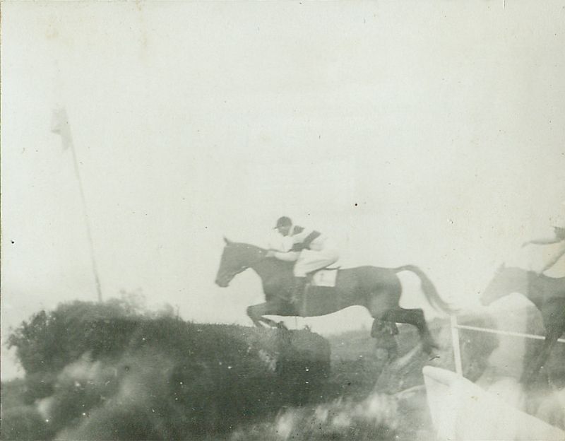 | Nr. inwentarzowy: MŁJ-XVI 1745 / 00 / 021 opis: Gonitwa, na przeszkodzie (rów z żywopłotem) Karol Rómmel na koniu Caraibe. Za nimi słabo widoczny drugi jeździec. K. Rómmel w stroju wyścigowym - ciemna czapka, jasna kurtka z ciemnym poprzecznym pasem.data: sierpieńczas powstania - daty graniczne: 1931-08-01 - 1931-08-31miejsce: Piotrków, tor wyścigów konnych.osoby: Ppłk Karol Rómmel, olimpijczyk, od 1929 r. w stanie spoczynku.tworzywo: papier fotograficzny, błyszczącytechnika: odbitka żelatynowo-srebrowa DOP, czarno-białazespół: album rodziny Leskichwymiary (wys. x szer.): 53 x 67 [mm] Koń: 1. Caraibe, wałach, rasa: xx, maść gniada, ur. 1918 - Lord Bourgoyne i Capucine, hod. Francja, sprow. jako ogier do Polski w 1924 przez J. Sosnowskiego, do poł. 1928 wł. St. Bronikowskiego (tr. Szyszkowski), później wł. K. Rómmla (trener). Na przełomie l. 20/30. XX w. startował w gł. w gon. przeszkodowych w Warszawie, Lwowie, Łodzi, Piotrkowie, Poznaniu, Lublinie, Wilnie, Tarnowskich Górach, Pardubicach (1931 Wlk. Pardubicka, nie ukończył); m.in. pod Falewiczem, Brzezińskim, Strużyńskim, Rómmlem, Bohdanowiczem. 20 razy wygrał.