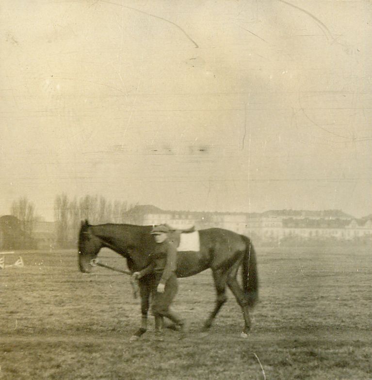 | Nr. inwentarzowy: MŁJ-XVI 1753 / 00 / 118 opis: Prezentacja koni ze stajni wyścigowej 9 p.s.k. - og. Kaprys. Chłopiec lub młody mężczyzna w stroju jeździeckim prowadzi w ręku osiodłanego konia po trawiastym podłożu. W tle topole i zabudowania wokół toru.data: kwiecień 1930 r.czas powstania - daty graniczne: 1930-04-01 - 1930-04-30miejsce: Warszawa, Pole Mokotowskie, tor wyścigów konnychinne nazwy własne: 9 Pułk Strzelców Konnych imienia generała Kazimierza Pułaskiego tworzywo: papier fotograficzny, błyszczącytechnika: odbitka żelatynowo-srebrowa DOP, czarno-białazespół: album rodziny Bohdanowiczówwymiary (wys. x szer.): 51 x 49 [mm] Koń: 1. Kaprys, ogier, rasa: xx, maść gniada, ur. 1925 - Ballyheron — Kathleen (ex Bogracs), hod. Franciszka Wężyka, wł. grona oficerów 9 p.s.k., trener Józef Kowalski; biegał w wyścigach płaskich i płotowych na przełomie l. 20-30. XX w. na torach w Warszawie, Łodzi, Wilnie, Grajewie, Ciechocinku, Bydgoszczy. Ks. st.: PSB III str.170.