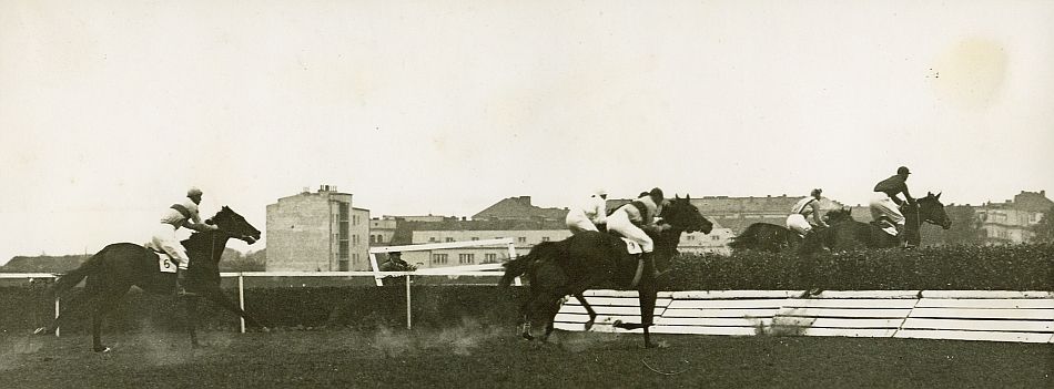 | Nr. inwentarzowy: MŁJ-XVI 1751 / 00 / 025 opis: Tor wyścigów konnych. Gonitwa płotowa dla 3 l. i st. koni, nagr. 7000 zł, dyst. 4000 m. Pięć koni przed, na i za przeszkodą - płotem. Prowadzi por. Michał Bohdanowicz (barwy stajni "Bończa: k. r. i cz. zielone w podłużne pasy biało-czarne) na koniu Jar. Para ta zajęła drugie miejsce. Wygrał Lopek pod Jerzym Antropowem (barwy stajni E. Grzybowskiego: k. żółta , r. i cz. białe) - za koniem z numerem 3.czas powstania - daty graniczne: 1933-10-15 - 1933-10-15miejsce: Warszawa, Pole Mokotowskieosoby: Por. Michał Bohdanowicz 1903–1948 (syn Jana Bohdanowicza i Marii „Maryni” z Cywińskich, 9 p.s.k., później 4 p.u. i 13 p.u.); kpt. Jerzy Antropow 1883-1938 (7 DAK).tworzywo: papier fotograficzny, półbłyszczącytechnika: odbitka żelatynowo-srebrowa DOP, czarno-białazespół: album rodziny Bohdanowiczówwymiary (wys. x szer.): 80 x 215 [mm] Konie: 1. Jar, ogier, rasa: xx, maść gniada, ur. 1929 - Parsifal – Reduta, hod. Konstantego hr. Zamoyskiego (Stado Natalin), startował w barwach stajni „Bończa” w latach 1931–1933, w gonitwach płaskich i płotowych, na torach w Warszawie, Łodzi, Katowicach, Poznaniu i Lwowie. Dosiadali go m.in. dż. Ignacy Magdaliński, por. Bohdanowicz. Zajął 18 razy płatne miejsca, w tym 8 pierwszych. 2. Lopek, ogier, rasa: xx, maść gniada, ur. 1928 - Mości Książę — Ambitna, hod. Eugeniusza Grzybowskiego. W 1933 startował na torach w Warszawie, Katowicach, Poznaniu, w gonitwach płaskich i płotowych (15 x płatne miejsca, 5 zwycięstw), wł. i tr. rtm. W. Zgorzelski, dosiadał go m.in. Jerzy Antropow.