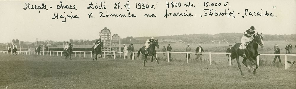 | Nr. inwentarzowy: MŁJ-XVI 1751 / 00 / 024 opis: Tor wyścigów konnych. Gonitwa przeszkodowa hand., nagr. 15000 zł, dyst. 4800 m. Osiem koni galopuje w odległościach, wygrywa stajnia Karola Rómmla: og. Flibustier pod ppłk. Rómmlem, drugi wał. Caraibe pod por. Michałem Bohdanowiczem. Trzecia galopuje i zajęła takie miejsce klacz Frasquita pod A. Tuńskim (barwy stajni 19 p.u.: k. granatowa z dwoma poprzecznymi białymi pasami, r. granatowe, cz. czerwona).czas powstania - daty graniczne: 1930-07-27 - 1930-07-27miejsce: Łódźosoby: Ppłk Karol Rómmel (1888-1967, trener i jeździec klasy międzynarodowej, olimpijczyk); por. Michał Bohdanowicz 1903–1948, syn Jana Bohdanowicza i Marii „Maryni” z Cywińskich, 9 p.s.k., później 4 p.u. i 13 p.u.); por. Aleksander Tuński (ur. 1900, od 1929 r. w stanie spoczynku, wcześniej 19 p.u.).tworzywo: papier fotograficzny, półbłyszczącytechnika: odbitka żelatynowo-srebrowa DOP, czarno-białazespół: album rodziny Bohdanowiczówwymiary (wys. x szer.): 66 x 215 [mm] Konie: 1. Flibustier, ogier, rasa: xx, maść gniada, ur. 1926 - Harlekin — Lotos, hod. Janusza hr. Czarneckiego, wł. Margr. i A. hr. Wielopolskich, w l. 1930-32 K. Rómmla, w 1933 kupiony na reproduktora przez Andrzeja Niegolewskigo. Startował w l. 1928-31 w gonitwach płaskich, płotowych i przeszkodowych na torach w Warszawie i Łodzi. Dosiadali go dż. Józef Dorosz, dż. Stanisław Pasternak, dż. Jerzy Szyszkowski, j. Gajewski, K. Rómmel, por. Tuński, a trenowali: Stefan Michalczyk, Jerzy Szyszkowski, K. Rómmel. 19 x płatne miejsca, w tym 8 x pierwsze. 2. Caraibe, wałach, rasa: xx, maść gniada, ur. 1918 - Lord Bourgoyne i Capucine, hod. Francja, sprow. jako ogier do Polski w 1924 przez J. Sosnowskiego, do poł. 1928 wł. St. Bronikowskiego (tr. Szyszkowski), później wł. K. Rómmla (trener). Na przełomie l. 20/30. XX w. startował w gł. w gon. przeszkodowych w Warszawie, Lwowie, Łodzi, Piotrkowie, Poznaniu, Lublinie, Wilnie, Tarnowskich Górach, Pardubicach (1931 Wlk. Pardubicka, nie ukończył); m.in. pod Falewiczem, Brzezińskim, Strużyńskim, Rómmlem, Bohdanowiczem. 20 razy wygrał. 3. Frasquita, klacz, rasa: xx, maść gniada, ur. 1924 - Balthazar — Galachat, hod. Michała Róga, wł. Grona oficerów 19 p.u.; dosiadał jej Aleksander Tuński