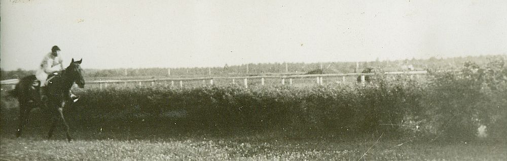 | Nr. inwentarzowy: MŁJ-XVI 1756 / 03 / 033 opis: Tor wyścigów konnych, prosta finiszowa. Por. Michał Bohdanowicz (w stroju wyścigowym) na koniu Równy tuż przed zwycięstwem w gonitwie przeszkodowej. Para ta wygrała podczas mitingu w Baranowiczach steeple-chase dwukrotnie. Prawdopodobnie barwy stajni rtm. Choroszewskiego: k. i r. błękitne, cz., mankiety i zygzak na plecach srebrne.data: 29 czerwca lub 6 lipca - w tych dniach M. Bohdanowicz wygrał na Równymczas powstania - daty graniczne: 1933-06-29 - 1933-07-06miejsce: Baranowiczeosoby: Por. Michał Bohdanowicz 1903-1948 (syn Jana Bohdanowicza i Marii z Cywińskich. W latach 1932-1936 i przed II wojną w 4 Pułku Ułanów Zaniemeńskich, od 1936 w 13 Pułku Ułanów Wileńskich; nazywany "Misiem").tworzywo: papier fotograficzny, półbłyszczącytechnika: odbitka żelatynowo-srebrowa DOP, czarno-białazespół: album rodziny Bohdanowiczówwymiary (wys. x szer.): 37 x 107 [mm] Koń: 1. Równy, wałach, rasa: półkrwi, maść skarogniada - po Konwent i Powaga, hod. St. Ciemniewski, wł. rtm. K. Choroszewski. Startowali na nim w biegach na przełaj i steeple-chase M. Bohdanowicz i wł. Żelewski