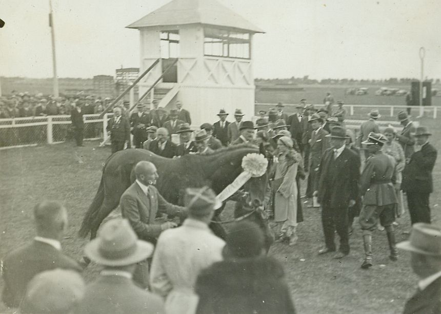 | Nr. inwentarzowy: MŁJ-XVI 1745 / 00 / 027 opis: Wyścigi, po gonitwie Derby. Aleksander Tuński (w garniturze) prowadzi za wodze zwycięzcę Derby półkrwi w Piotrkowie, konia Boer (wpięta wielka wstęga). Wokół ludzie, kibice, w tle drewniana, piętrowa wieżyczka.data: sierpieńczas powstania - daty graniczne: 1931-08-01 - 1931-08-31miejsce: Piotrków, tor wyścigów konnych.osoby: Por. Aleksander Tuński (1900-), od 1929 r. w stanie spoczynku, wcześniej 19 p.u.tworzywo: papier fotograficzny, błyszczącytechnika: odbitka żelatynowo-srebrowa DOP, czarno-białazespół: album rodziny Leskichwymiary (wys. x szer.): 83 x 114 [mm]