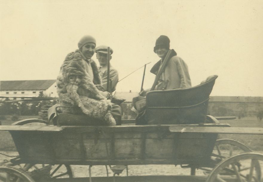 | Nr. inwentarzowy: MŁJ-XVI 1743 / 00 / 060 opis: Bryczka kielecka (z przodu ławka, z tyłu pełne siedzenie). Na miejscu powożącego siedzi mężczyzna w kaszkiecie (Stanisław S.), obok p. Leska w futrze i berecie (tyłem do kierunku jazdy). Na siedzeniu pasażerskim druga kobieta w płaszczu i kapelusiku. W tle zabudowania.czas powstania - daty graniczne: 1930-10-01 - 1930-10-31miejsce: Łękawaosoby: Anna lub Wanda Leska, Stanisław S. (Staś)tworzywo: papier fotograficzny, matowytechnika: odbitka żelatynowo-srebrowa DOP, czarno-białazespół: album rodziny Leskichwymiary (wys. x szer.): 57 x 80 [mm]
