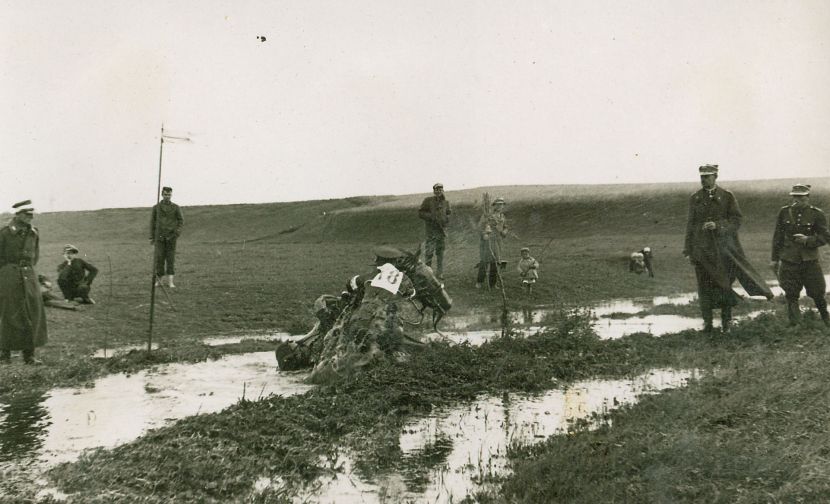 | Nr. inwentarzowy: MŁJ-XVI 1757 / 00 / 059 opis: Konne Mistrzostwa Wojska Polskiego "Militari". Próba terenowa (kros, cross). Grząską rzeczkę pokonuje rtm. Bronisław Kulik. Zawodnik z trudem usiłuje podnieść konia z błota. Opis w albumie: II faza: rtm. Kulik wyciąga konia. Wokół około dziesięciu osób - wojskowych i cywilnych kibiców, w tym dzieci.