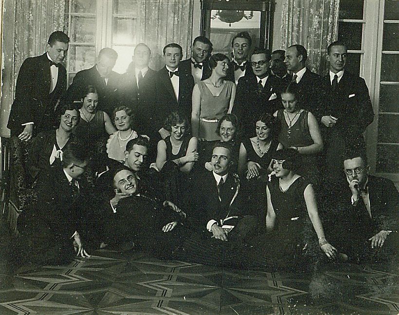 | Nr. inwentarzowy: MŁJ-XVI 1744 / 00 / 025 opis: Spotkanie u Irène. 24 osoby w dobrym humorze - siedzą na intarsjowanym parkiecie, meblach i stoją. Wśród nich siostry Wanda i Anna Leskie. Większość mężczyzn w garniturach, kobiety w sukniach, wiele z odkrytymi ramionami, w biżuterii. Wnętrze zamożnego domu. W tle wysokie okna, lustro.czas powstania - daty graniczne: 1931-02-01 - 1931-02-28miejsce: Warszawaosoby: siostry Leskie najwyżej z siedzących - z lewej Wanda Leska (1908-1991), z prawej Anna Leska (1910-1998)tworzywo: papier fotograficzny, półbłyszczącytechnika: odbitka żelatynowo-srebrowa DOP, czarno-białazespół: album rodziny Leskichwymiary (wys. x szer.): 50 x 62 [mm]