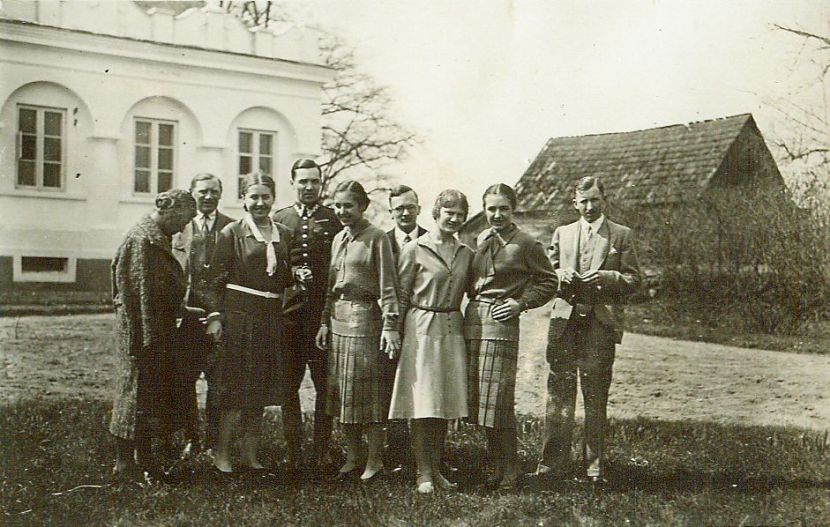 | Nr. inwentarzowy: MŁJ-XVI 1753 / 00 / 142 opis: Goście i gospodarze w Parzniewicach. Od lewej stoją: Maria Leska, Kazimierz Kotliński, Zofia Pietraszewska, rtm. Wilhelm Lewicki, Wanda Leska, p. Zbyszek, Janina Kotlińska, Anna Leska, Jerzy Pietraszewski. W tle naroże dworu (widać attykę) i budynek gospodarczy.data: kwiecień 1930 r.czas powstania - daty graniczne: 1930-04-01 - 1930-04-30miejsce: Parzniewice (łódzkie, majątek Kotlińskich, od 1931 r. Wereszczyńskich)osoby: Maria Leska 1886-1949; Kazimierz Kotliński "Papa" 1880-1955 (do 1931 r. właściciel maj. Parzniewice); Zofia Pietraszewska 1910-1983; Rtm. Wilhelm Rogala-Lewicki 1898-1992; Wanda Leska 1908-1991 (później Bohdanowicz); p. Zbyszek(?); Janina Kotlińska 1907-1989; Anna Leska 1910-1998 ("Anka", później Leska-Daab); Jerzy Pietraszewski 1903-1974 lub 1982.tworzywo: papier fotograficzny, półbłyszczącytechnika: odbitka żelatynowo-srebrowa DOP, czarno-białazespół: album rodziny Bohdanowiczówwymiary (wys. x szer.): 55 x 84 [mm]