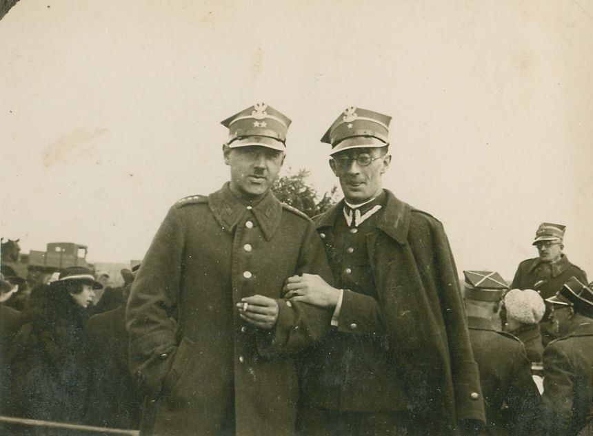 | Nr. inwentarzowy: MŁJ-XVI 1629 / 00 / 007 opis: Bieg myśliwski - grupa oficerów i pań na dworze - kibice i organizatorzy? Dwóch oficerów (porucznik i podporucznik?) stoi obok siebie, jeden pali papierosa, w tle większa grupa ludzi - widać kilku oficerów i 2 kobiety. W głębi koń, samochód ciężarowy.czas powstania - daty graniczne: 1938-01-01 - 1938-12-31miejsce: okolice Hrubieszowatworzywo: papier fotograficzny, półbłyszczącytechnika: odbitka żelatynowo-srebrowa DOP, czarno-białazespół: album rodziny Grotthuswymiary (wys. x szer.): 65 x 85 [mm]