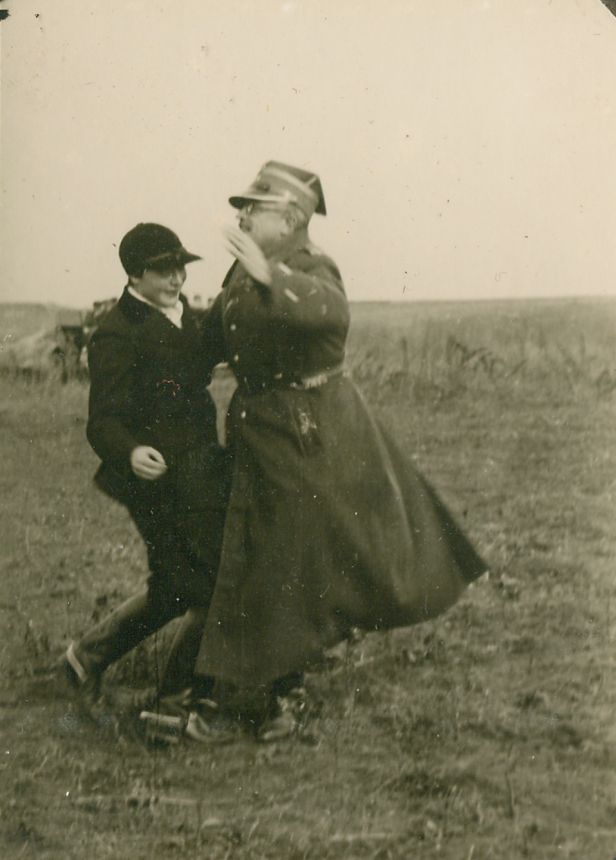| Nr. inwentarzowy: MŁJ-XVI 1629 / 00 / 017 opis: Po zakończeniu rajdu Hrubieszów-Włodzimierz Wołyński - tańce na dużej łące. Jadwiga Grottus (w ciemnym stroju jeździeckim, toczku, ostrogach) i płk Romuald Niementowski (w długim płaszczu i okularach).czas powstania - daty graniczne: 1936-01-01 - 1939-08-31miejsce: okolice Hrubieszowaosoby: płk Romuald Niementowski (wiceprezes zarządu HKJ, dowódca 2 p.s.k. w Hrubieszowie), Jadwiga Grotthus (1920-2011), córka Gustawa i Anny zd. Chłapowskiejinne nazwy własne: Hrubieszowski Klub Jeździecki i 2 Pułk Strzelców Konnych - organizatorzy imprez jeździeckichtworzywo: papier fotograficzny, półbłyszczącytechnika: odbitka żelatynowo-srebrowa DOP, czarno-białazespół: album rodziny Grotthuswymiary (wys. x szer.): 84 x 66 [mm]
