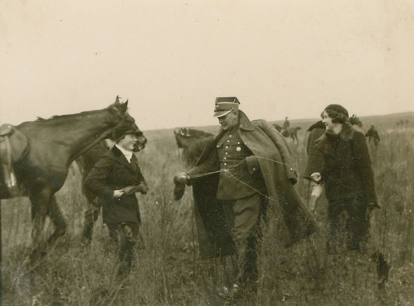| Nr. inwentarzowy: MŁJ-XVI 1629 / 00 / 042 opis: Po biegu. Na otwartej przestrzeni ze schnącymi zaroślami konie i ludzie w tym Jadwiga Grotthus w stroju jeździeckim, oficer w płaszczu, kobieta w ciemnym płaszczu i berecie. Po lewej ktoś prowadzi konia, w głębi inne odpoczywające w stępie konie i ludzie.data: prawdopodobnie jesień 1938czas powstania - daty graniczne: 1938-03-01 - 1938-12-31miejsce: okolice Hrubieszowaosoby: Jadwiga Grotthus (1920-2011), córka Gustawa i Anny zd. Chłapowskiejtworzywo: papier fotograficzny, półbłyszczący, Agfa-Gevaerttechnika: odbitka żelatynowo-srebrowa DOP, czarno-białazespół: album rodziny Grotthuswymiary (wys. x szer.): 65 x 85 [mm]