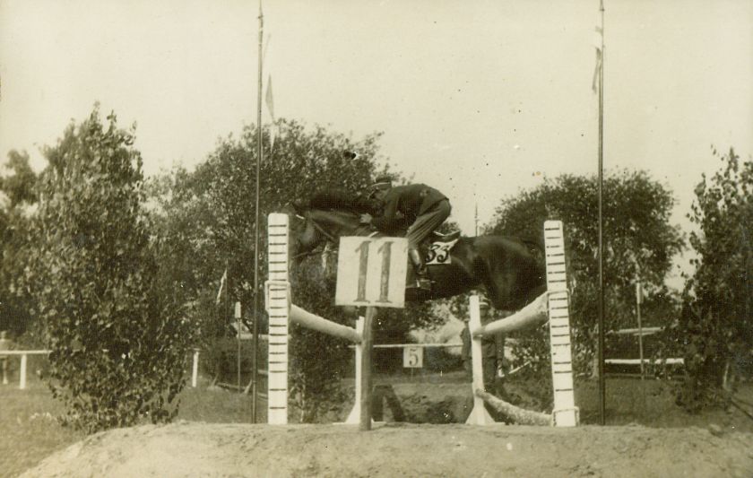 | Nr. inwentarzowy: MŁJ-XVI 1753 / 00 / 021 opis: Letnie konkursy hipiczne. Rtm. Wilhelm Lewicki skacze na klaczy Mira przez okser numer 11, położony na piaszczystej górce.data: zawody rozpoczęto 21 lipcaczas powstania - daty graniczne: 1929-07-21 - 1929-07-31miejsce: Gdynia, Polana Redłowskaosoby: Rtm. Wilhelm Rogala-Lewicki 1898-1992 Londyn ("Wil", jeździec klasy międzynarodowej, w Gdyni reprezentował W.S.W.)inne nazwy własne: W.S.W. - Wyższa Szkoła Wojenna, Polanka Redłowskatworzywo: papier fotograficzny, półmatowytechnika: odbitka żelatynowo-srebrowa DOP, czarno-białazespół: album rodziny Bohdanowiczówwymiary (wys. x szer.): 87 x 135 [mm] Koń: 1. Mira, klacz - koń, na którym w konkursach skoków startował w l. 1926-1931 W. Lewicki, na zdjęciu: w Gdyni w 1929 r. bez sukcesów