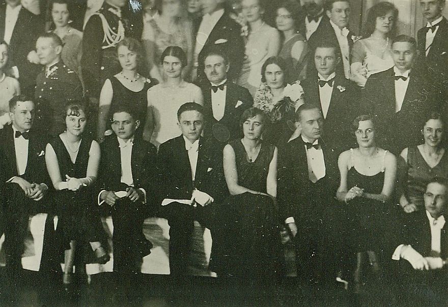 | Nr. inwentarzowy: MŁJ-XVI 1744 / 00 / 022 opis: "Czarna Kawa" u "Platerek" [gimnazjum, które ukończyły siostry Leskie]. Około trzydzieściorga młodych uczestników siedzi i stoi w 3 rzędach. Mężczyźni we frakach lub smokingach, dwóch w mundurach. Panie w sukniach, wiele z odkrytymi ramionami.czas powstania - daty graniczne: 1931-01-01 - 1931-01-31miejsce: Warszawa, ul. Piękna, żeńskie gimnazjum im. Cecylii Plater-Zyberkównyosoby: w środkowym rzędzie, z lewej - jedna z sióstr Leskichtworzywo: papier fotograficzny, półmatowytechnika: odbitka żelatynowo-srebrowa DOP, czarno-białazespół: album rodziny Leskichwymiary (wys. x szer.): 59 x 84 [mm]