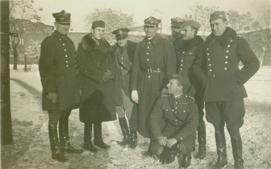 | Nr. inwentarzowy: MŁJ-XVI 1519 / 00 / 054 opis: C.W.K., 8 oficerów upozowanych do zdjęcia, w środku rtm. Stefan Starnawski (1899-?) 20 p.u.; trzeci z lewej kapitan armii amerykańskiej; w tle zabudowania Centrumdata: zima, w 1932 r. Stefan Starnawski startował barwach C.W.K.czas powstania - daty graniczne: 1932-01-01 - 1932-12-31miejsce: Polska, Grudziądz, C.W.K. [Centrum Wyszkolenia Kawalerii]osoby: rtm Stefan Starnawski (1899-?) 20 p.u.; I Kurs Podinstruktorów Jazdy Konnej 25.10.1923 – 30.09.1924; jeździec klasy międzynarodowej; 1927 1. m. w PN w Łazienkach i Nowym Jorku; 1929 1. m. w PN w Nowym Jorku. Wysoki, startował na małym Hannibalutworzywo: papier fotograficzny, półmatowytechnika: odbitka żelatynowo-srebrowa DOP, czarno-białazespół: album rodziny Nieniewskichwymiary (wys. x szer.): 56 x 85 [mm]