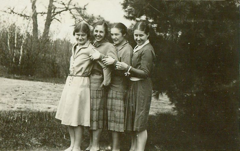 | Nr. inwentarzowy: MŁJ-XVI 1753 / 00 / 134 opis: Pod sosną stoją od lewej: Janina Kotlińska, Wanda i Anna Leskie (w podobnych strojach), Zofia Pietraszewska.data: kwiecień 1930 r.czas powstania - daty graniczne: 1930-04-01 - 1930-04-30miejsce: Parzniewice (łódzkie, majątek Kotlińskich, od 1931 r. Wereszczyńskich)osoby: Janina Kotlińska 1907-1989 („Nina”, "Ninon"); Wanda Leska 1908-1991 (później Bohdanowicz) i Anna Leska 1910-1998 ("Anka", później Leska-Daab); Zofia Pietraszewska 1910-1983 („Zosia”, córka Zygmunta wł. maj. w Drzazgowej Woli i Janiny zd. Wróblewskiej, siostra Jerzego). tworzywo: papier fotograficzny, półmatowytechnika: odbitka żelatynowo-srebrowa DOP, czarno-białazespół: album rodziny Bohdanowiczówwymiary (wys. x szer.): 52 x 81 [mm]