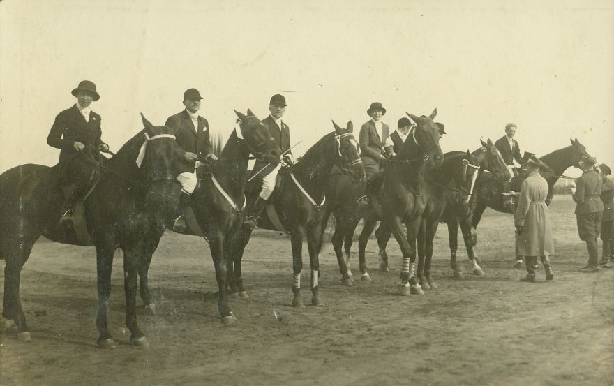 | Nr. inwentarzowy: MŁJ-XVI 1641 / 00 / 014 opis: Zawody organizowane przez Komitet Targów Końskich w Gnieźnie, wręczanie nagród. Plac konkursowy - na szeregu stojących koni siedzą cywile obojga płci. Jeździeckie stroje konkursowe, panowie w białych bryczesach i toczkach, panie na ciemno, w melonikach. Nagrody wręcza 3 wojskowych i cywil w cylindrze.data: podano daty pierwszego dnia zawodów w 1930 i ostatniego w 1939 r., prawdopodobnie 28.04.-03.05. 1934 r.czas powstania - daty graniczne: 1930-04-25 - 1939-05-03miejsce: Gniezno, hipodrom Komitetu Targów Końskich w Gnieźnieinne nazwy własne: Konkurs dla Jeźdźców Cywilnychtworzywo: papier fotograficzny, półmatowytechnika: odbitka żelatynowo-srebrowa DOP, czarno-białazespół: album rodziny Brökerewymiary (wys. x szer.): 88 x 137 [mm]