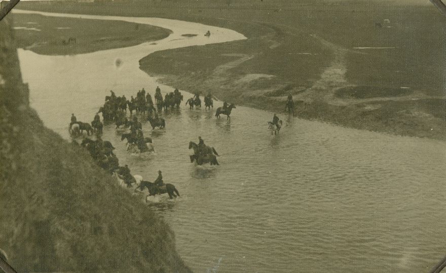 | Nr. inwentarzowy: MŁJ-XVI 1629 / 00 / 027 opis: Bieg myśliwski, przejazd przez rzekę Huczwę. Zdjęcie z góry, płytka, meandrująca rzeka, w nurcie kilkadziesiąt koni pod jeźdźcami (woda sięga koniom do stawów skokowych), bliższy brzeg wysoki, dalszy płaski.data: prawdopodobnie jesień 1938czas powstania - daty graniczne: 1938-03-01 - 1938-12-31miejsce: okolice Hrubieszowa, rzeka Huczwatworzywo: papier fotograficzny, satynowytechnika: odbitka żelatynowo-srebrowa DOP, czarno-białazespół: album rodziny Grotthuswymiary (wys. x szer.): 85 x 135 [mm]