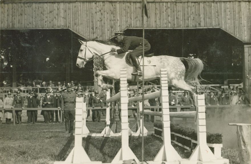 | Nr. inwentarzowy: MŁJ-XVI 1743 / 00 / 010 opis: Międzynarodowe zawody konne. Por Wł. Zgorzelski w skoku na siwym koniu Orzeł przez szeroką, jasną przeszkodę (piramida ze wskazówką - niską hyrdą). Piękny skok. Na czapraku nr 9. Za przeszkodą stoi wojskowy, w tle drewniane trybuny, publiczność.czas powstania - daty graniczne: 1930-06-01 - 1930-06-11miejsce: Warszawa, Łazienki, hipodromosoby: por. Władysław Zgorzelski (1901-1998)tworzywo: papier fotograficzny, półbłyszczącytechnika: odbitka żelatynowo-srebrowa DOP, czarno-białazespół: album rodziny Leskichwymiary (wys. x szer.): 120 x 180 [mm] Koń: 1. Orzeł, maść siwa