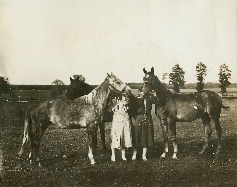 | Nr. inwentarzowy: MŁJ-XVI 1745 / 00 / 002 opis: Dwie młode kobiety - Irène (w jasnej sukience) i Janina Kotlińska (w ciemnej sukience), stoją na łące i trzymają za kantary młode konie: Kamelja i Ela.data: czerwiecczas powstania - daty graniczne: 1931-06-01 - 1931-06-30miejsce: Parzniewice (łódzkie, majątek Kotlińskich, od 1931 r. Wereszczyńskich)osoby: Irène; Janina Kotlińska 1907-1989 („Nina”, "Ninon", córka Kazimierza i Eugenii zd. Grudzińskiej, siostra Edmunda)tworzywo: papier fotograficzny, błyszczącytechnika: odbitka żelatynowo-srebrowa DOP, czarno-białazespół: album rodziny Leskichwymiary (wys. x szer.): 83 x 103 [mm] Konie: 1. Ela, klacz, maść kasztanowata, ur. 1929 - klacz najprawdopodobniej hod. K. Kotlińskiego z Parzniewic 2. Kamelja, klacz, maść siwa - młoda klacz siwo-jabłkowita