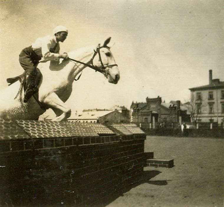 | Nr. inwentarzowy: MŁJ-XVI 1753 / 00 / 112 opis: Anna Leska w treningowym skoku przez przeszkodę - mur. Kobieta w treningowym stroku jeździeckim, w tle zabudowania.data: kwiecień 1930 r.czas powstania - daty graniczne: 1930-04-01 - 1930-04-30miejsce: Warszawa, ul. Koszykowa 79, Wyższa Szkoła Wojenna, ujeżdżalnia położona w kwartale: Koszykowa – Krzywickiego/Sucha – 6 Sierpnia/Nowowiejska – Topolowa/Al. Niepodległościosoby: Anna Leska 1910-1998 ("Anka", członkini K.S.R.W.; później Leska-Daab, podczas II wojny światowej pilot w Wielkiej Brytanii).inne nazwy własne: W.S.W - WSW - W.S.Woj. - Wyższa Szkoła Wojennatworzywo: papier fotograficzny, błyszczącytechnika: odbitka żelatynowo-srebrowa DOP, czarno-białazespół: album rodziny Bohdanowiczówwymiary (wys. x szer.): 58 x 61 [mm] Koń: 1. Feliks, maść siwa - koń, na którym w 1930 roku trenowała i wystartowała w Warszawie (Łazienki) Anna Leska