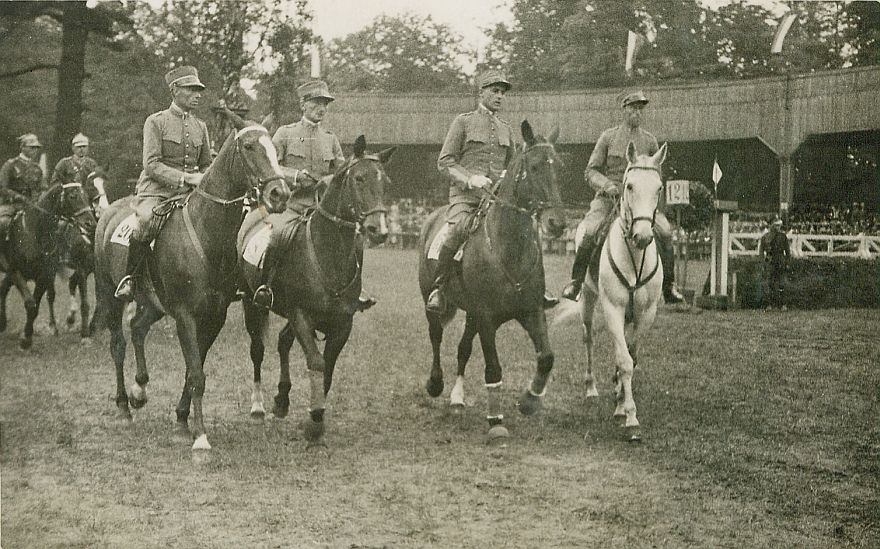 | Nr. inwentarzowy: MŁJ-XVI 1744 / 00 / 073 opis: Międzynarodowe i Krajowe Konkursy Hipiczne w Łazienkach, zespół Szwajcarii na Puchar Narodów. W szeregu kłusują na koniach: mjr Kuhn na Corona, kpt. de Muralt na Écriture, por. Haecky na Séverina, por. Simmen na Secretaire (wg. W. Pruskiego w PN startował na Bravo). Za nimi ekipa Polski - widać 2 jeźdźców. W tle przeszkoda, trybuny, drzewa.czas powstania - daty graniczne: 1931-05-28 - 1931-06-08miejsce: Warszawa, hipodrom w Łazienkachosoby: Szwajcarzy, od lewej: mjr Charles-Gustave Kuhn (1889-1952, IO 1928, skoki brąz ind., kpt. Pierre de Muralt (1896-1985, IO 1928, skoki), por. Haecky, por. Simmeninne nazwy własne: Lt., Leutnanttworzywo: papier fotograficzny, półbłyszczącytechnika: odbitka żelatynowo-srebrowa DOP, czarno-białazespół: album rodziny Leskichwymiary (wys. x szer.): 84 x 133 [mm] Konie: 1. Bravo - koń, na którym wg. W. Pruskiego Simmen startował w PN 2. Corona - koń, na którym startował Ch.-G. Kuhn 3. Écriture - koń, na którym startował P. de Muralt 4. Séverina - koń, na którym startował Haecky 5. Secretaire, maść siwa - koń, na którym startował Simmen