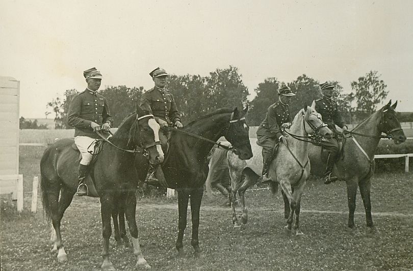 | Nr. inwentarzowy: MŁJ-XVI 1758 / 00 / 053 opis: Tor wyścigów konnych, zawody konne - konkurs ciężki. W szeregu stoją cztery konie pod jeźdźcami - najlepsze pary w konkursie. Od lewej: rtm. Michał Bohdanowicz 4 p.u. na koniu Talar (1. m.), rtm. Konstanty Anton 4 p.u. na koniu Winiet (2. m.), por. Wacław Kosiński 23 p.u. na koniu Wicher, rtm. Grzegorz Druhowino 23 p.u. na koniu Amsterdam (4. m.).czas powstania - daty graniczne: 1935-07-11 - 1935-07-11miejsce: Wilno, Pośpieszkaosoby: Rtm. Michał Bohdanowicz 1903-48 ("Miś", w l.1932-36 w 4 p.u.); rtm. Konstanty Anton 1900-40 Katyń (4 p.u.; 13 p.u.; dow. szwadronu. kawalerii K.O.P. „Krasne”, 1923-25 wykładowca w Szkole dla Podoficerów w Bydgoszczy); por. Wacław Kosiński ur. 1891 r. (23 p.u., startował w lokalnych zawodach w skokach, a w 1925 r. w Konnych MWP, w których 23 p.u. zajął 1. m.); rtm. Grzegorz Druhiwino 1897-1956 (23 p.u., startował w lokalnych zawodach w skokach, a w 1924 r. w Konnych MWP).inne nazwy własne: Konne MWP - Konne Mistrzostwa Wojska Polskiego - Militari. K.O.P. - Korpus Ochrony Pogranicza.tworzywo: papier fotograficzny, błyszczącytechnika: odbitka żelatynowo-srebrowa DOP, czarno-białazespół: album rodziny Bohdanowiczówwymiary (wys. x szer.): 83 x 121 [mm] Konie: 1. Talar III, wałach, maść kasztanowata - hod. Bogumiła Hebanowskiego; ur. przed 1928, prywatny koń Michała Bohdanowicza, który startował na nim w konkursach ujeżdżenia, skoków (np. Mitingi Popularne PZJ 1938-39 i WKKW ("Militari"), biegach myśliwskich, skiringu, uczestniczył w ćwiczeniach wojskowych. Dosiadała go też żona Michała - Wanda (m.in. w 1937 r. w Grudziądzu).., na zdjęciu: 1. miejsce 2. Winiet, rasa: x, maść skarogniada, ur. 1926 - po Rittersporn i Bajadera, hod. Aleksander Szeptycki, wł. Henryk Strzeszewski, w l. 1935-1939 startował w ujeżdżeniu, skokach, biegach przełajowych i gonitwach przeszkodowych, m.in. pod właścicielem i rtm. K. Antonem (Wilno, Warszawa, Zakopane)., na zdjęciu: 2. miejsce 3. Wicher, maść siwa - być może młodziutki wałach, syn węgierskiego og. 1417 Schagya XXI-2 i kl. Esmeralda, hod. Józefa Czernickiego. Podczas startu w Wilnie w 1935 r. w skokach widać wschodnią urodę, ale też nerwowość, a w pysku munsztuk. Pod W. Kosińskim startował w Wilnie w skokach w 2. poł. l. 30. XX w., na zdjęciu: 3. miejsce 4. Amsterdam, maść dereszowata - po Giergl i Baletnica, hod. Henryk Sosnowski, Michrów k. Grójca. W w 1935 r. startował w skokach w Wilnie pod rtm. G. Druhinowo., na zdjęciu: 4. miejsce