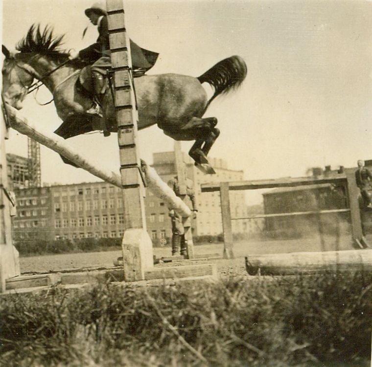 | Nr. inwentarzowy: MŁJ-XVI 1753 / 00 / 130 opis: Hanna Gajewska w treningowym skoku przez przeszkodę - double-barre na klaczy Issurja. Kobieta w kapeluszu i ciemnym fraku. Łeb koni na skraju kadru. Po prawej stronie przeszkody element pełniący rolę odkosu, po lewej rów, z którego wykonano zdjęcie. Dalej wojskowy pieszo i drugi konno, w tle budynki.data: kwiecień 1930 r.czas powstania - daty graniczne: 1930-04-01 - 1930-04-30miejsce: Warszawa, ul. Koszykowa 79, Wyższa Szkoła Wojenna, ujeżdżalnia położona w kwartale: Koszykowa – Krzywickiego/Sucha – 6 Sierpnia/Nowowiejska – Topolowa/Al. Niepodległościosoby: Hanna Gajewskainne nazwy własne: W.S.W - WSW - W.S.Woj. - Wyższa Szkoła Wojennatworzywo: papier fotograficzny, błyszczącytechnika: odbitka żelatynowo-srebrowa DOP, czarno-białazespół: album rodziny Bohdanowiczówwymiary (wys. x szer.): 61 x 62 [mm] Koń: 1. Issurja (Isurja), klacz, maść siwa - koń, na którym w 1930 r. w W.S.Woj. trenowali rtm. Małochleb i Hanna Gajewska