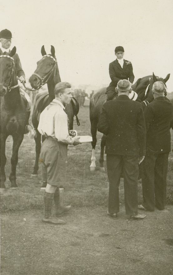 | Nr. inwentarzowy: MŁJ-XVI 1641 / 00 / 010 opis: Zawody organizowane przez Komitet Targów Końskich w Gnieźnie, wręczanie nagród. Plac konkursowy - na stojących koniach: R. Luettwitz na koniu Aster (w ręku trzyma drugiego konia) oraz R. Brökere na koniu Pelikan. Przed końmi harcerz, 2 cywili i kobieta (widać tylko kapelusz). W głębi inne osoby.czas powstania - daty graniczne: 1934-04-30 - 1934-04-30miejsce: Gniezno, hipodrom Komitetu Targów Końskich w Gnieźnieosoby: bar. Rochus Luettwitz z Oleśnicy i Romana (Roma) Brökere (1909-2001 ze Strumian, później Daszkowska)inne nazwy własne: Konkurs nr 7 P.P. cywilnych II. Imienia Komunalnej Kasy Oszczędności Powiatu Gnieźnieńskiego. Handicap „A”, wys. ok. 110 cm, szer. do 300 cmtworzywo: papier fotograficzny, półbłyszczącytechnika: odbitka żelatynowo-srebrowa DOP, czarno-białazespół: album rodziny Brökerewymiary (wys. x szer.): 138 x 89 [mm] Konie: 1. Aster, klacz, maść gniada, ur. 1923 - hod. i wł. Ulrich Uhle, Gorzewo 2. Pelikan, wałach, maść kasztanowata, ur. 1921 - hod. Niwiński, Miedrzewie, wł. rtm. Dobrzański, startował w skokach, m.in. w Gnieźnie, także pod A. Żychlińską i właścicielem