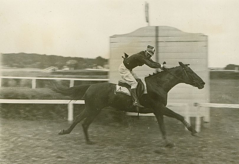 | Nr. inwentarzowy: MŁJ-XVI 1758 / 00 / 030 opis: Tor wyścigów konnych. Bieg na przełaj Szefa Departamentu Kawalerii Ministerstwa Spraw Wojskowych. Na celowniku zwycięzcy: rtm. Michał Bohdanowicz na koniu Równy. Rtm. Bohdanowicz w mundurze, w charakterystycznym dosiadzie, który nie ułatwia koniowi zadania. Równy z zapleciona grzywą, w ochraniaczach na przednich nogach, na potniku numer 1. Widać gruby czaprak - prawdopodobnie dociążenie.czas powstania - daty graniczne: 1935-07-07 - 1935-07-07miejsce: Wilno, Pośpieszkaosoby: Rtm. Michał Bohdanowicz 1903-48 (syn Jana Bohdanowicza i Marii z Cywińskich. W latach 1932-36 i przed II wojną w 4 p.u., nazywany "Misiem", w 1935 r. wygrał 12 gonitw podczas mitingu wyścigowego w Wilnie).tworzywo: papier fotograficzny, błyszczącytechnika: odbitka żelatynowo-srebrowa DOP, czarno-białazespół: album rodziny Bohdanowiczówwymiary (wys. x szer.): 86 x 125 [mm] Koń: 1. Równy, wałach, rasa: półkrwi, maść skarogniada - po Konwent i Powaga, hod. St. Ciemniewski, wł. rtm. K. Choroszewski. Startowali na nim w biegach na przełaj i steeple-chase M. Bohdanowicz i wł. Żelewski, na zdjęciu: 1. miejsce